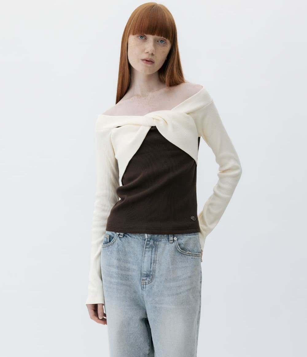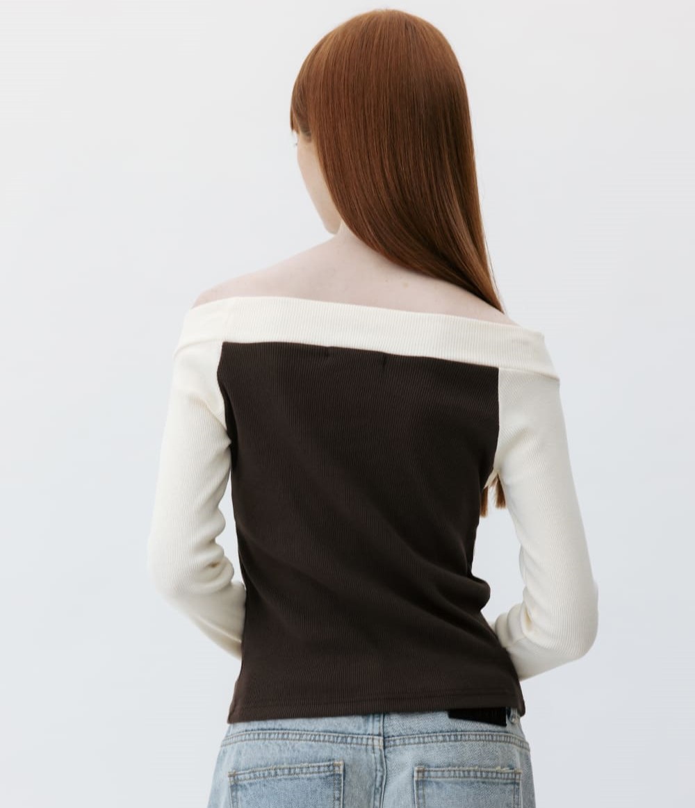 CO OFF SHOULDER COLOR MIX JERSEY TOP_BROWN