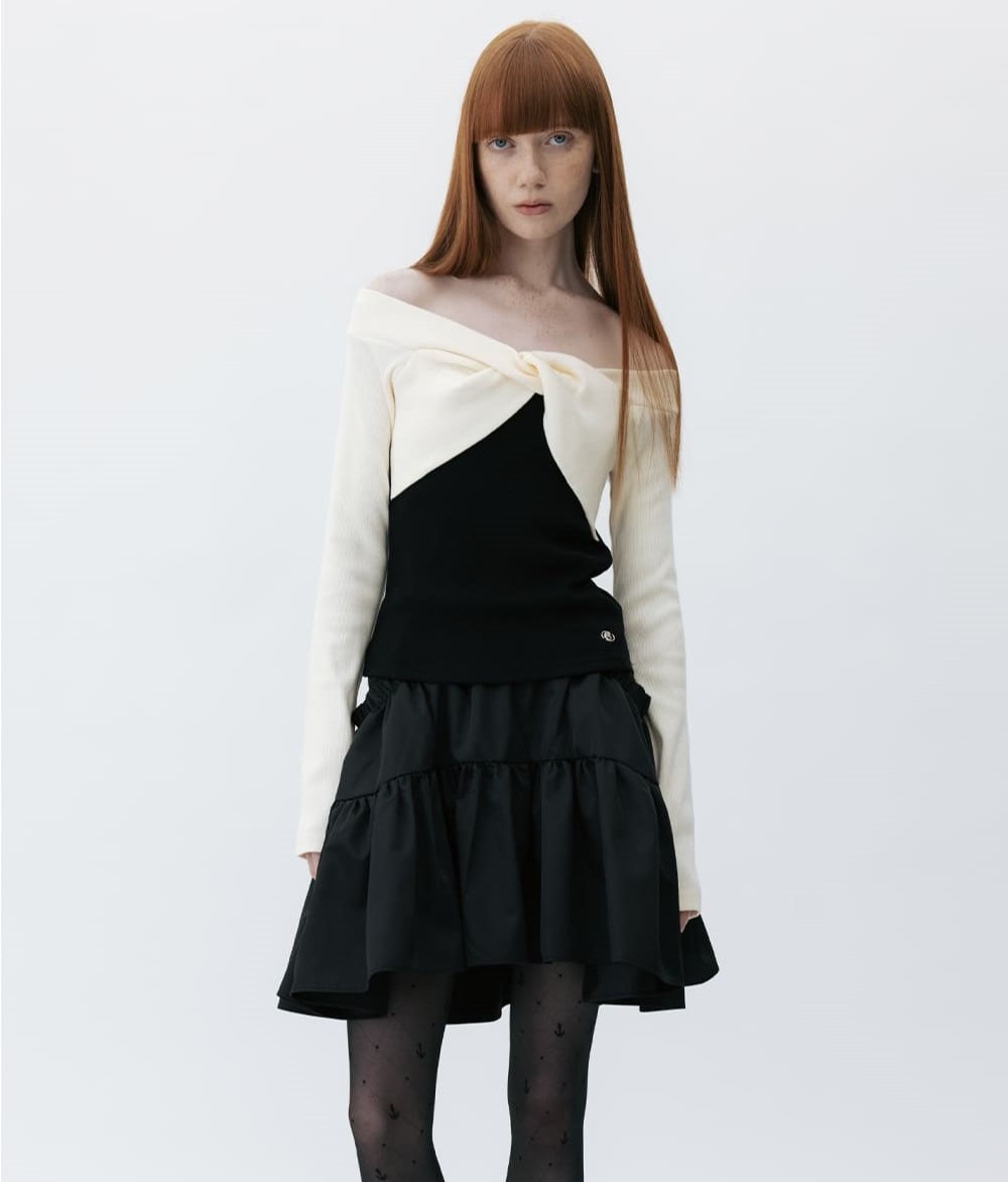 - 페미닌한 무드가 느껴지는 오프숄더 디자인입니다.