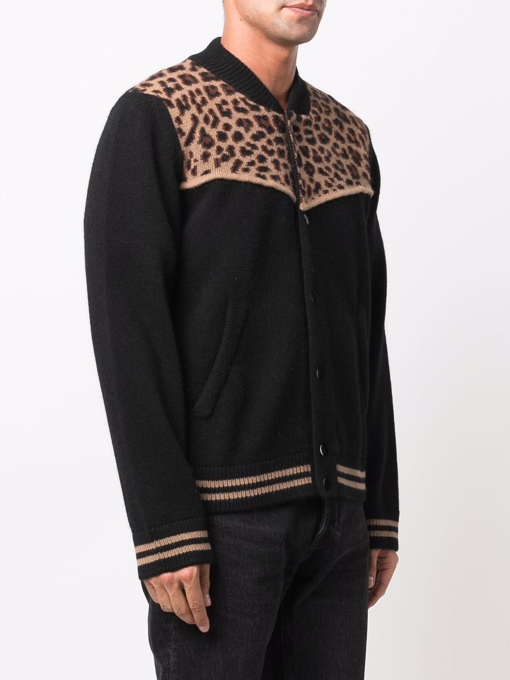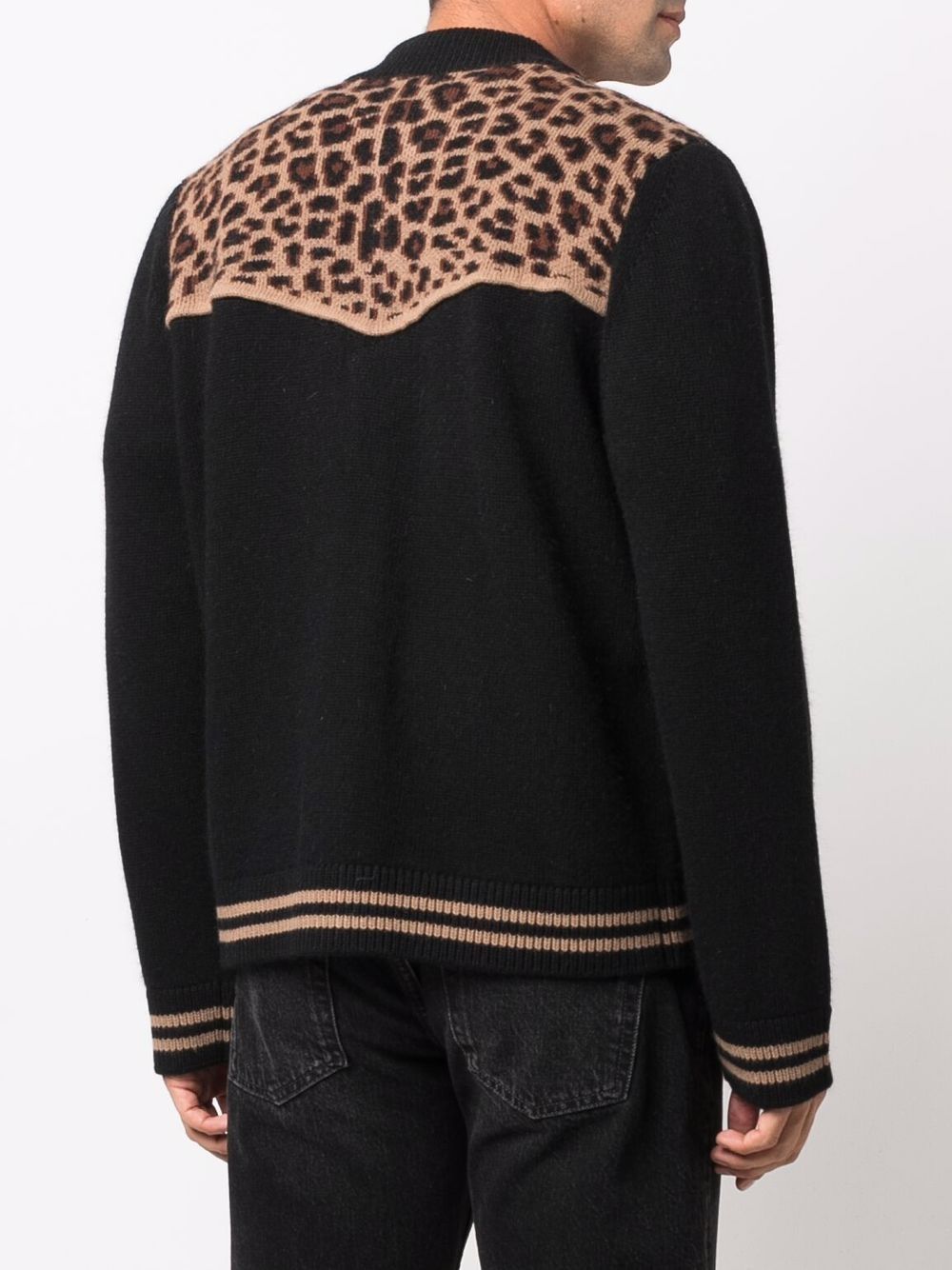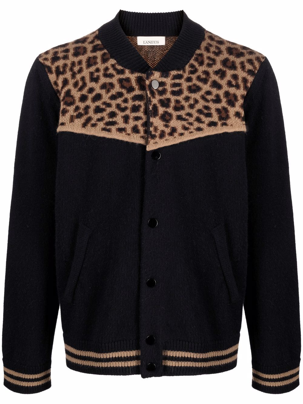 Black wool-cashgora blend leopard-panel jacket from LANEUS featuring panelled design, leopard print, long sleeves, front button fastening and stripe trim.