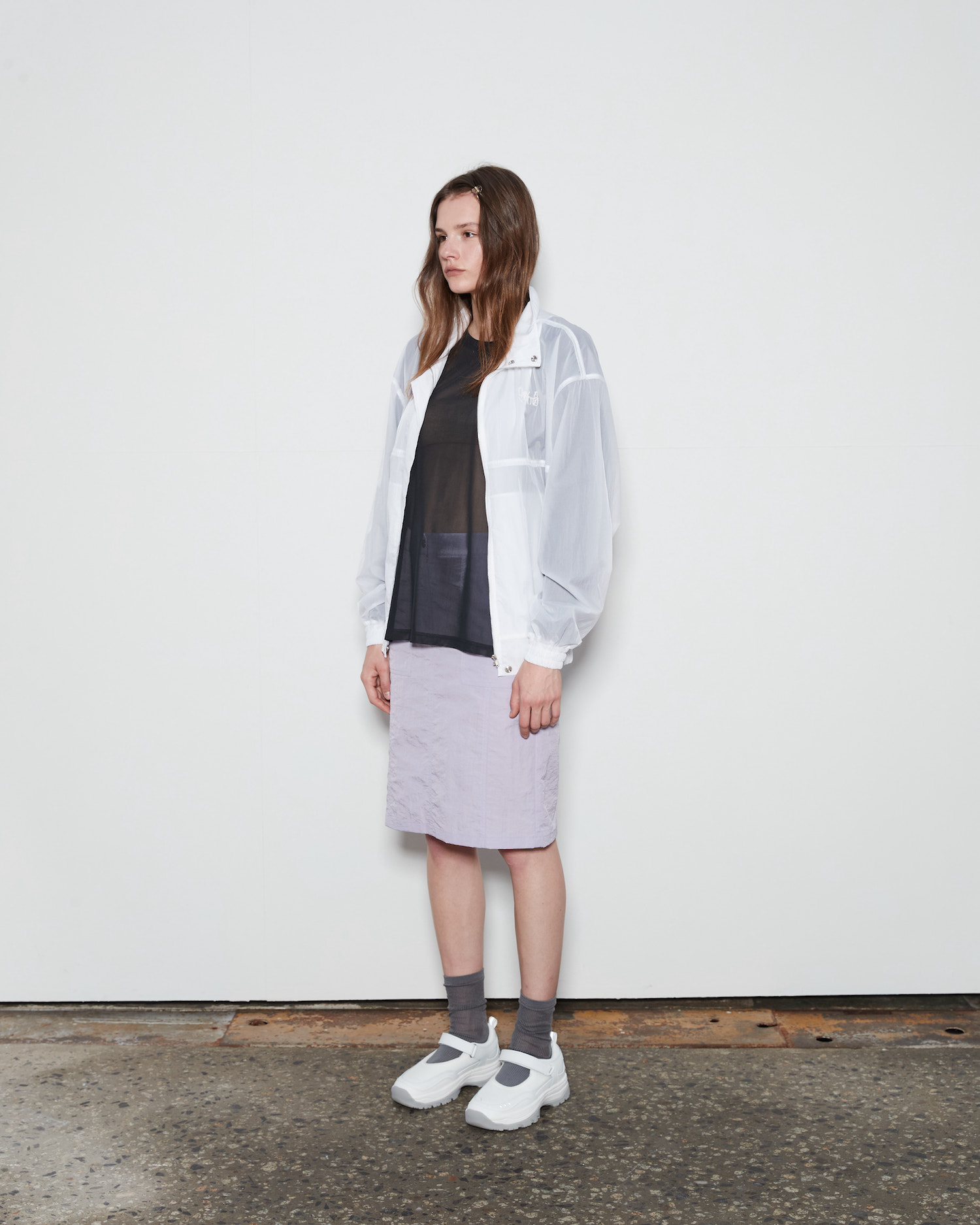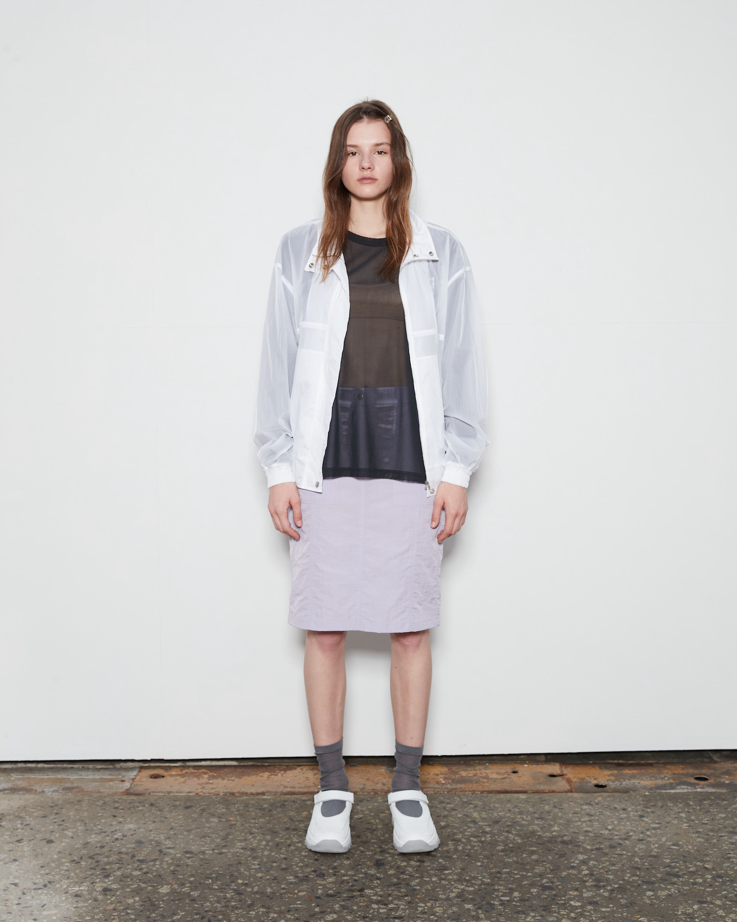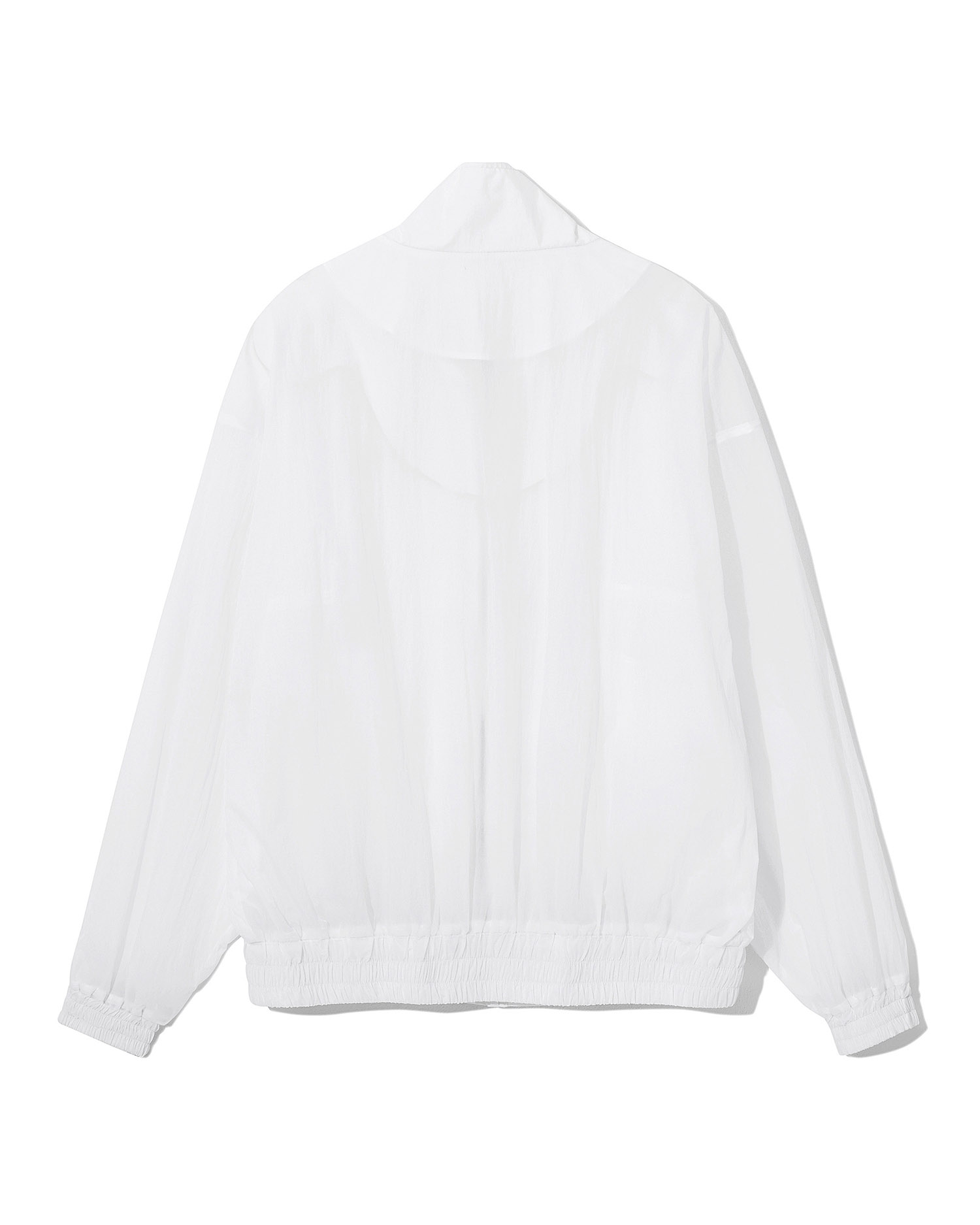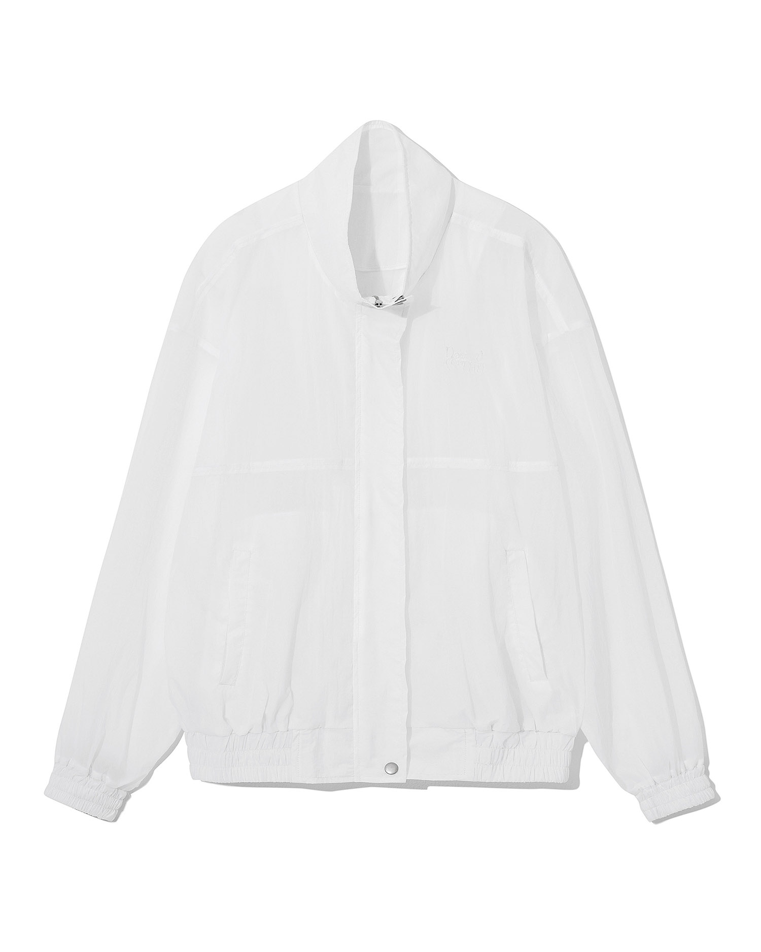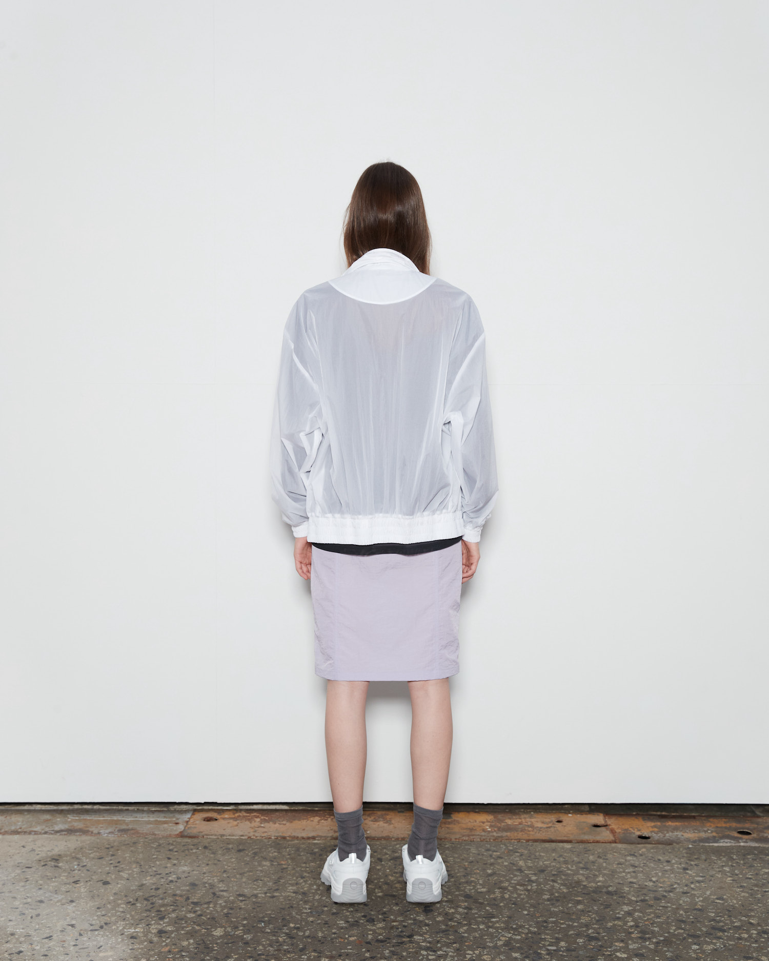 하이넥 디자인의 세미 오버핏 나일론 점퍼 얇은 15D 나일론 소재를 사용해 한여름에도 착용 가능한 아이템 시어한 소재로 은은한 비침과 라이트한 소재감 플라켓 클로징, 밑단과 소매 부분의 E- B