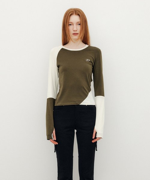 유즈 YUSE DIAGONAL COLOR BLOCK LONG SLEEVE T-SHIRT - KHAKI/IVORY는 카키와 아이보리 색상이 대각선으로 배색된 긴소매 티셔츠입니다. 슬림한 핏과 언밸런스한 소매 디테일이 포인트로, 캐주얼하면서도 세련된 분위기를 연출할 수 있습니다.