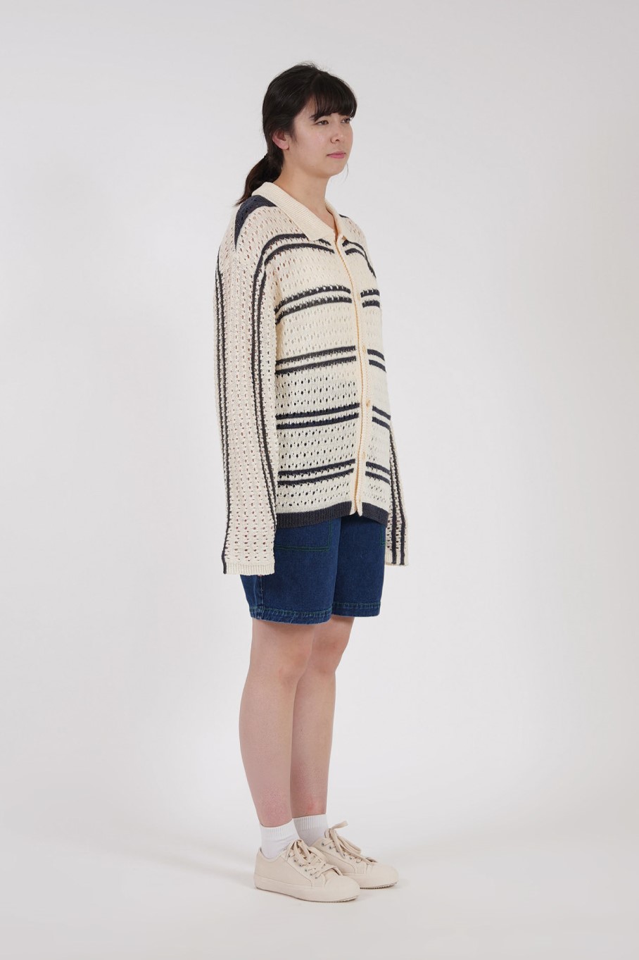IOEDLE의 네이비 스트라이트 메쉬 펀칭 카라 니트 가디건은 데님 팬츠와 매치하여 캐주얼한 스타일을 연출하기에도 좋습니다. 데님 팬츠에 가디건을 걸치고, 스니커즈나 슬립온을 신으면 편안하면서도 스타일리시한 캐주얼룩을 완성할 수 있습니다.