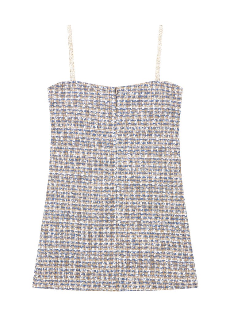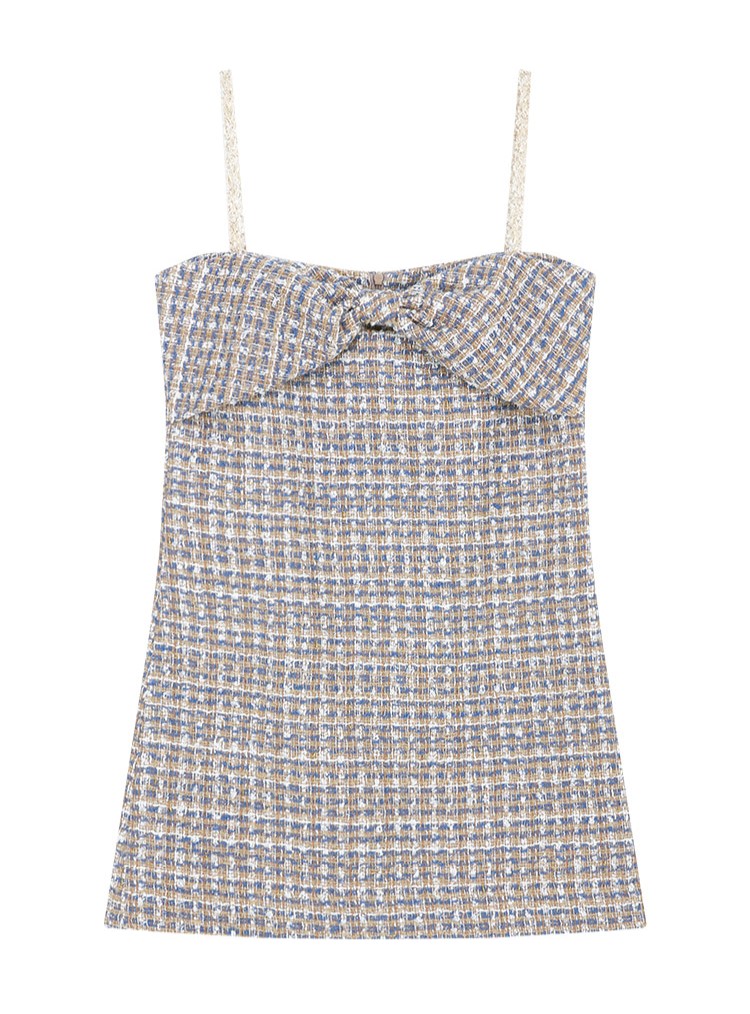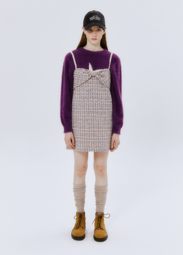 Margarin fingers 22 FW 트위기 리본 슬립 원피스입니다. - 트위드 원단의 A라인 미니 슬립 원피스 - 리본 모양의 가슴 디테일 - 트위드 테이프 어깨 끈