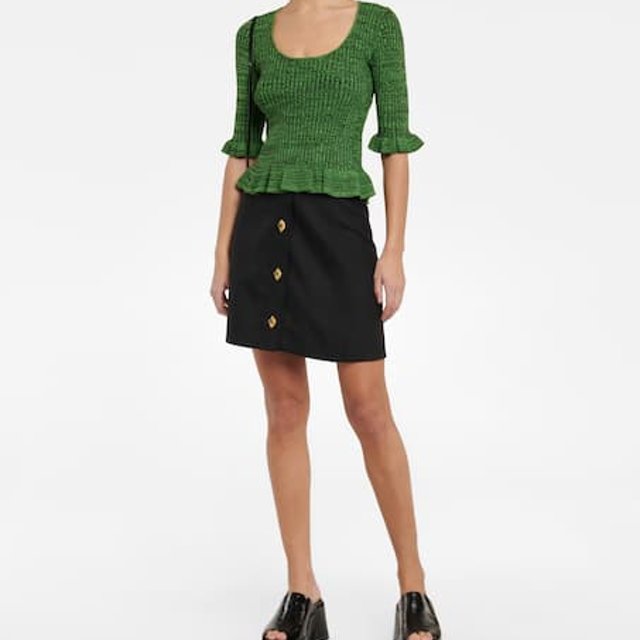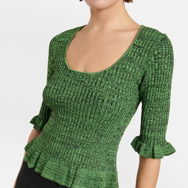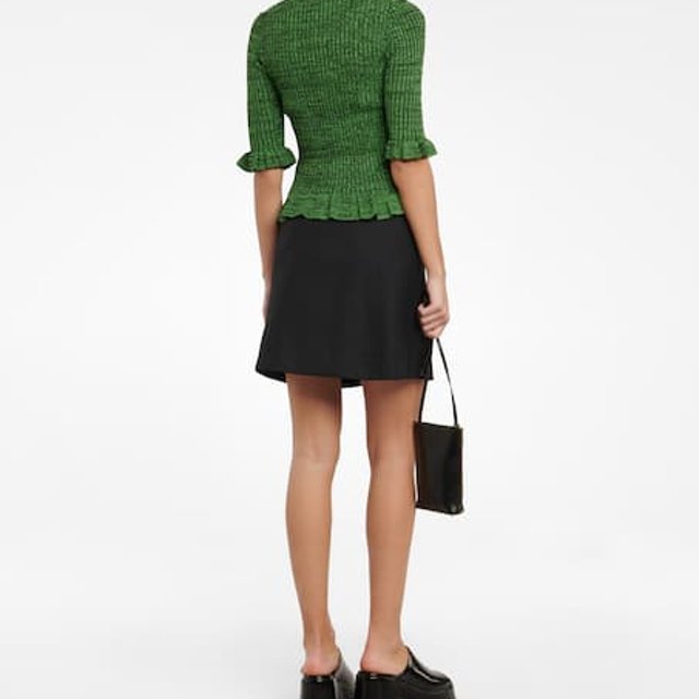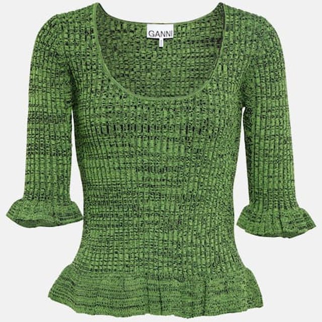 Ganni의 러플 트리밍 리브 니트 스웨터는 브랜드의 시그니처 디자인 중 하나입니다.