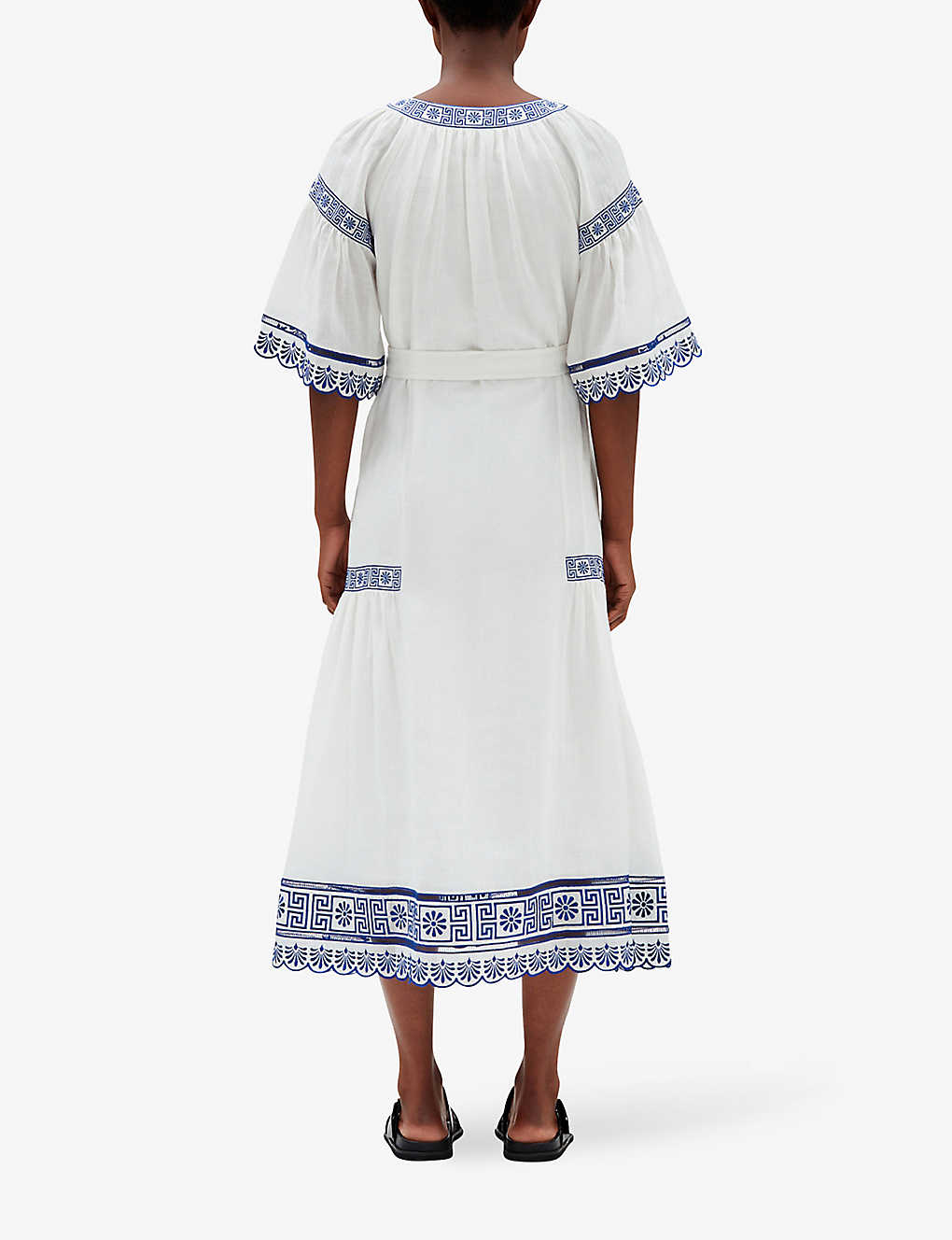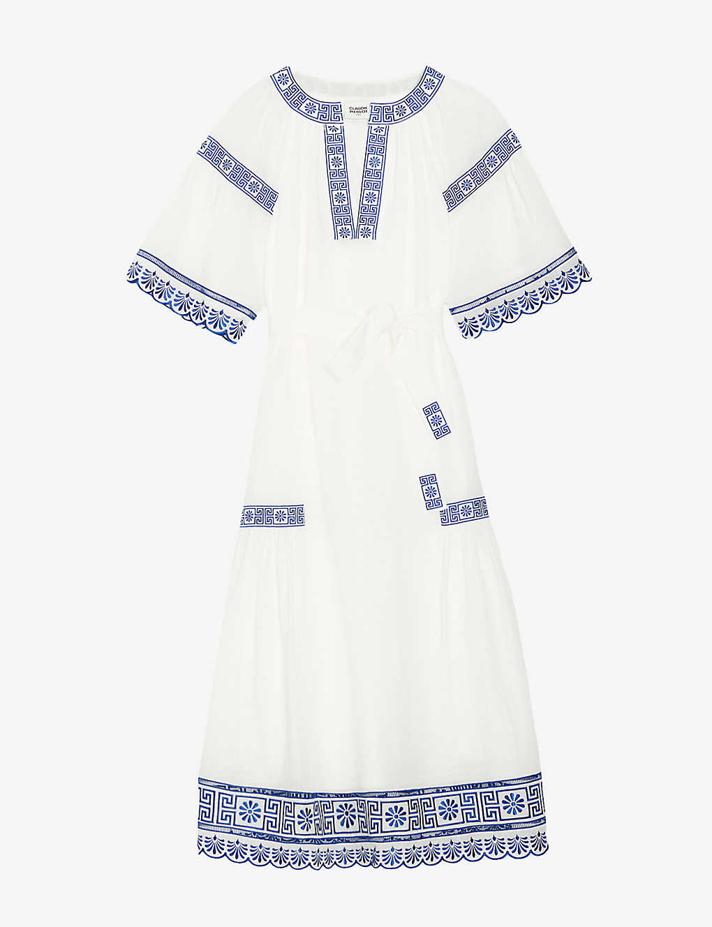 끌로디피에로의 엠브로이더리 스캘럽 트리밍 모시 블렌드 미디 드레스는 엠브로이더리 패턴과 스캘럽 트리밍이 특징인 모시 블렌드 소재의 미디 드레스입니다.