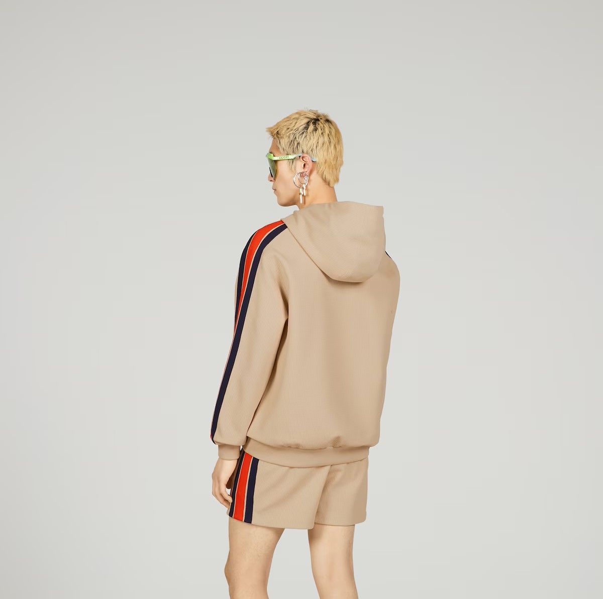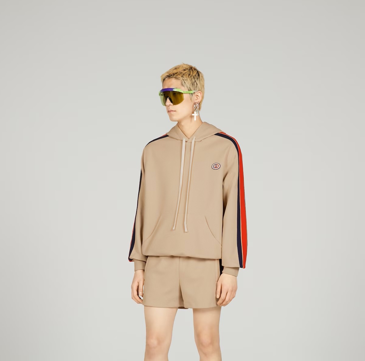구찌 저지 후드 스웨트셔츠는 구찌의 트레드 로고가 포인트로 들어간 디자인이 특징입니다.