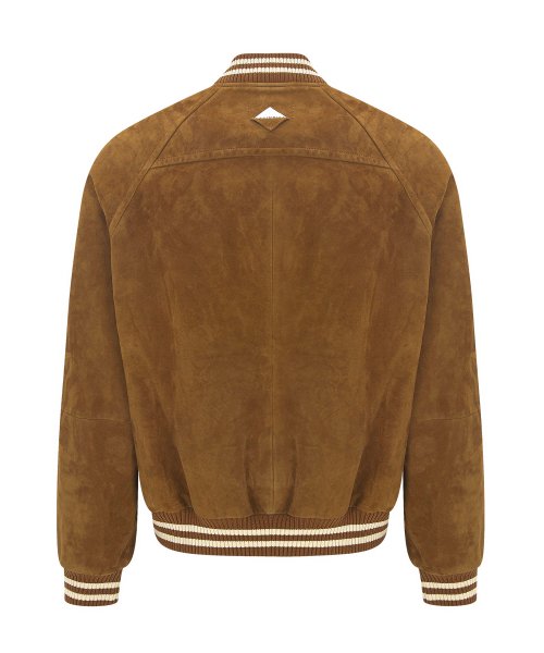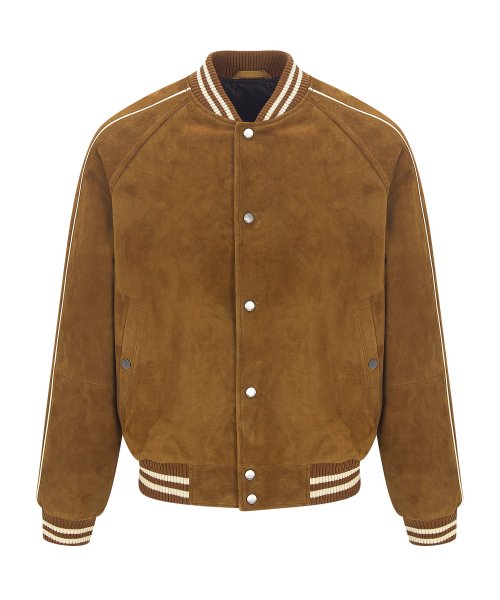 언지미크의 피핑 스웨이드 스타디움 재킷은 고급스러운 고트 스웨이드 소재로 제작되어 부드럽고 편안한 착용감을 제공합니다.