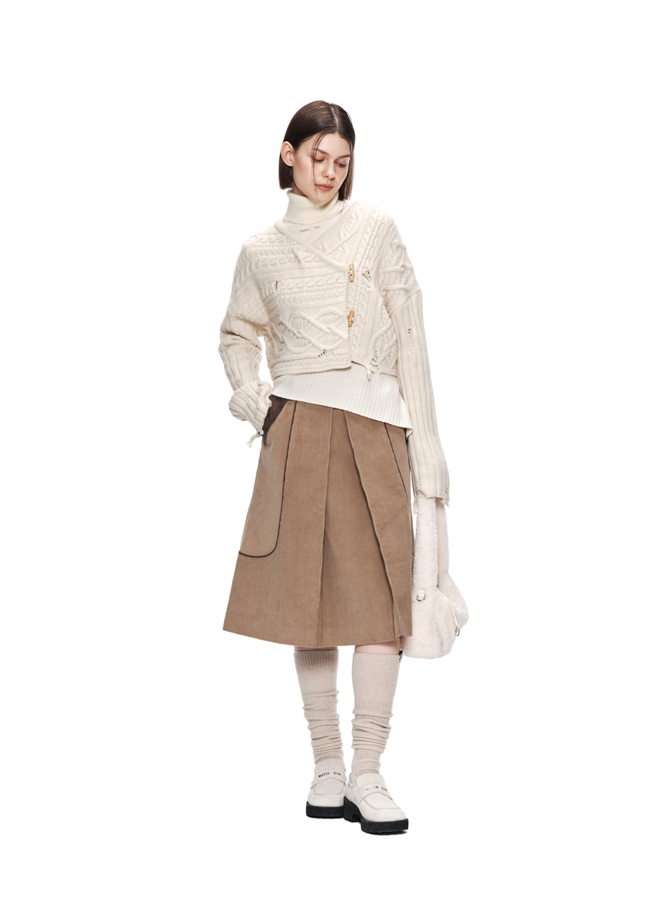 부드러운 울과 나일론, 폴리에스터 소재가 어우러져 피부에 닿는 순간 편안함을 선사하며, 언밸런스 케이블 조직은 독특한 질감과 입체감을 더합니다.