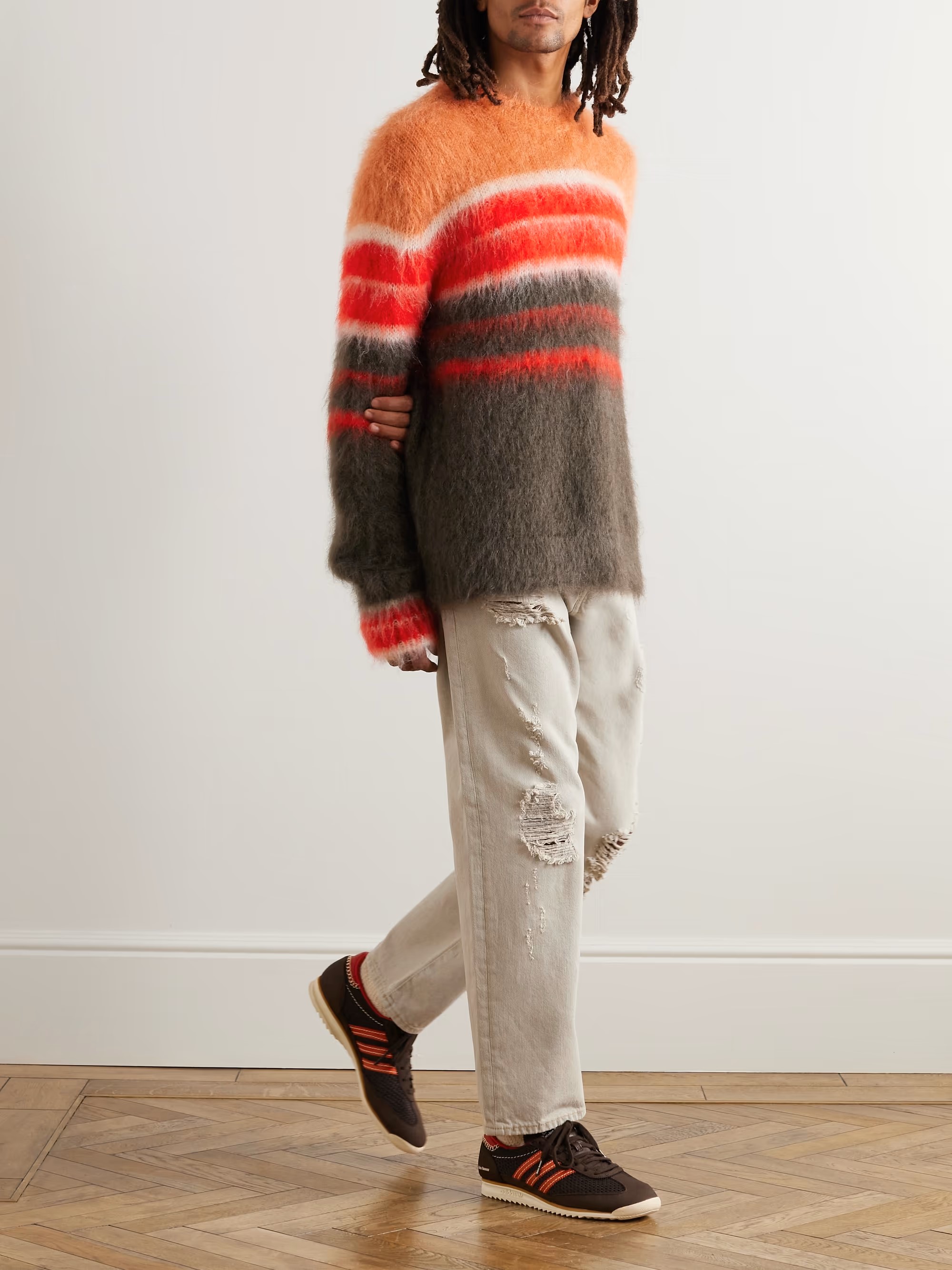 마르니 Striped Mohair-Blend Sweater는 블랙 데님과 매치하면 캐주얼하면서도 스타일리시한 데일리룩을 완성할 수 있습니다.
