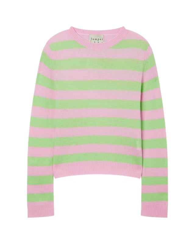 JUMPER 1234 스트라이프 크루 니트 - 로즈 네온 옐로우는 클래식하면서도 트렌디한 컬러 매치가 매력적인 아이템입니다.