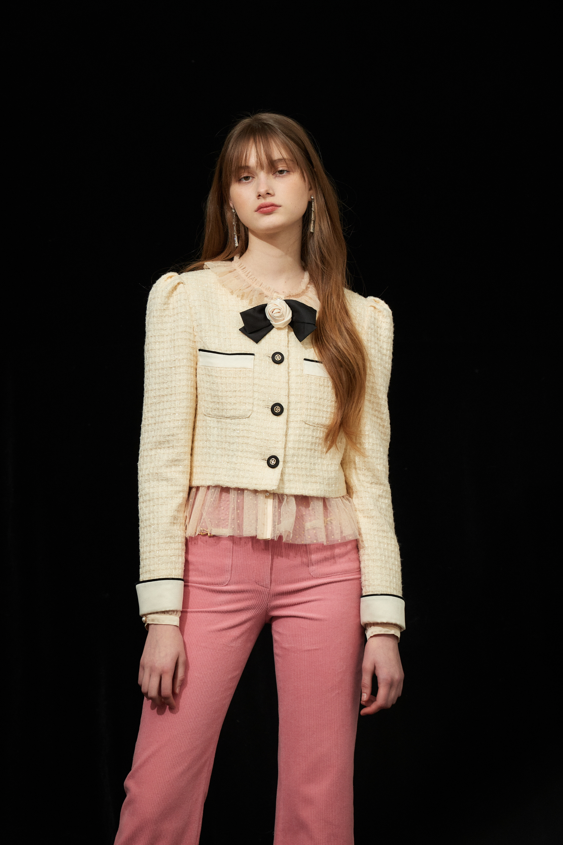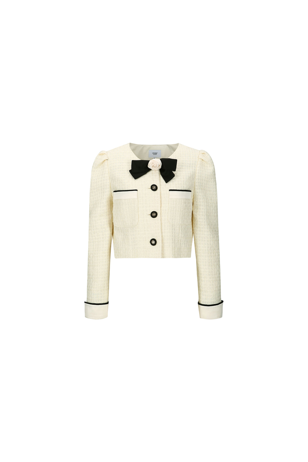 쟈니헤잇재즈 CORSAGE CROP JACKET - IVORY는 여성스러운 매력을 강조하고 싶은 날 선택할 아이템입니다.