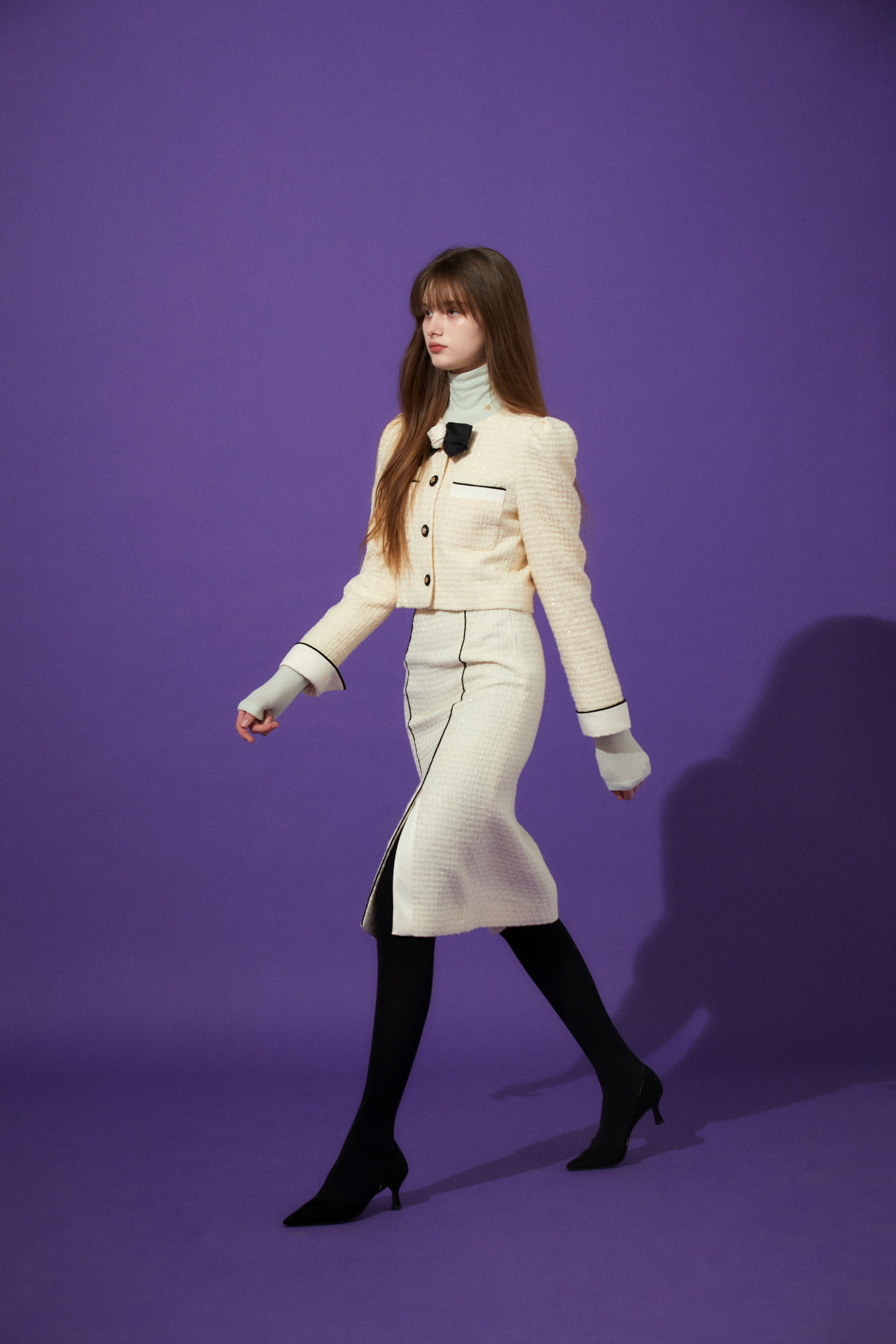 글리터한 원사로 짜여진 트위드 자켓입니다. 탈부착이 가능한 코사지 브로치가 포인트이며, 로고 단추 디테일과 포켓 및 소매에 새틴 배색과 벨벳 파이핑으로 세련미를 더해주었습니다.크롭 기