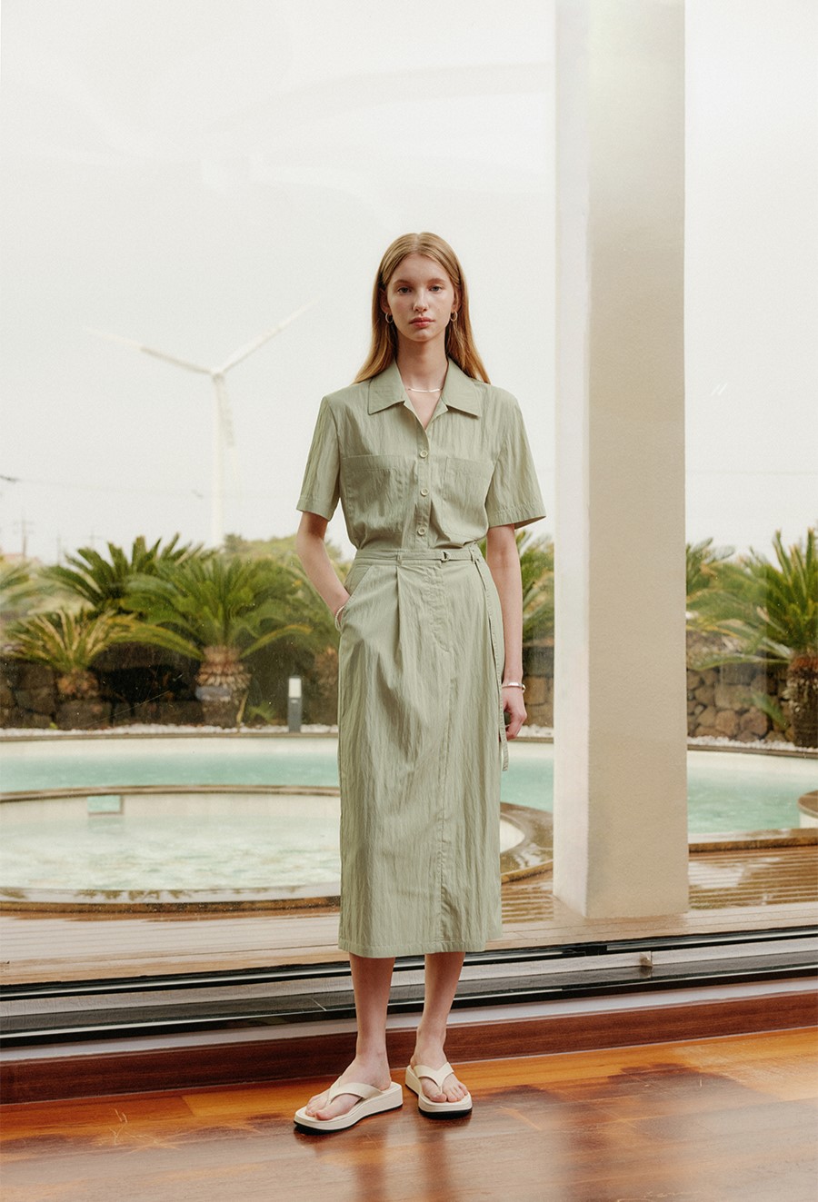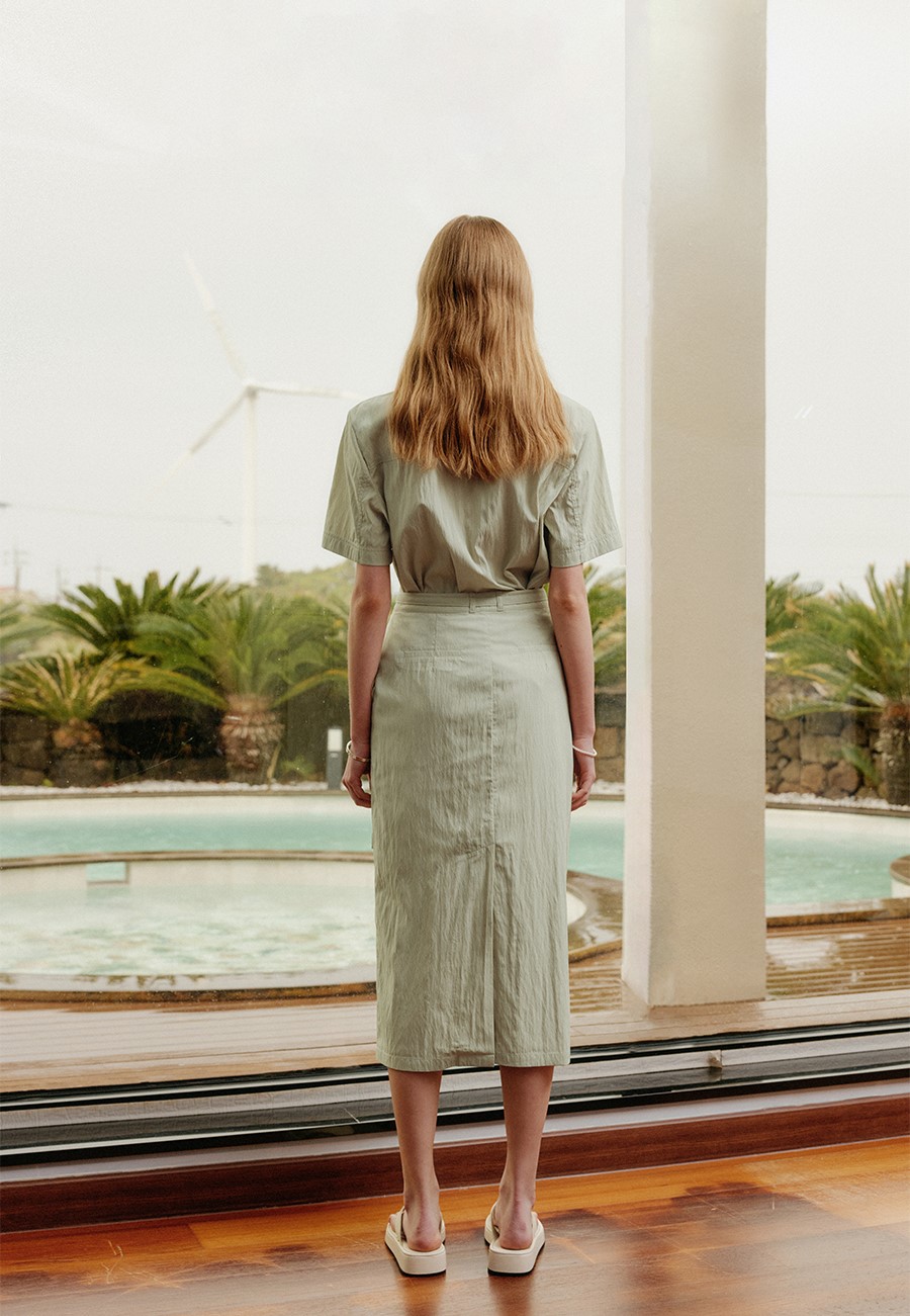 KHAKI IRIN STITCH SHIRT SET UP 미니멀한 디자인의 반팔 셔츠 & 미디스커트 셋업입니다.전체적으로 여유로운 실루엣으로 제작되어 활동성이 좋고,크리스피한 터치감의 소재를 사용하여 구김이 잘 가