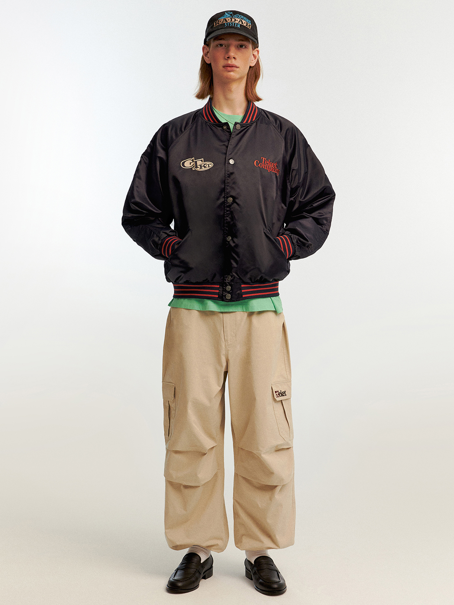 테켓의 Keyword Satin Jacket Navy는 넉넉한 핏의 네이비색 새틴 재킷입니다.