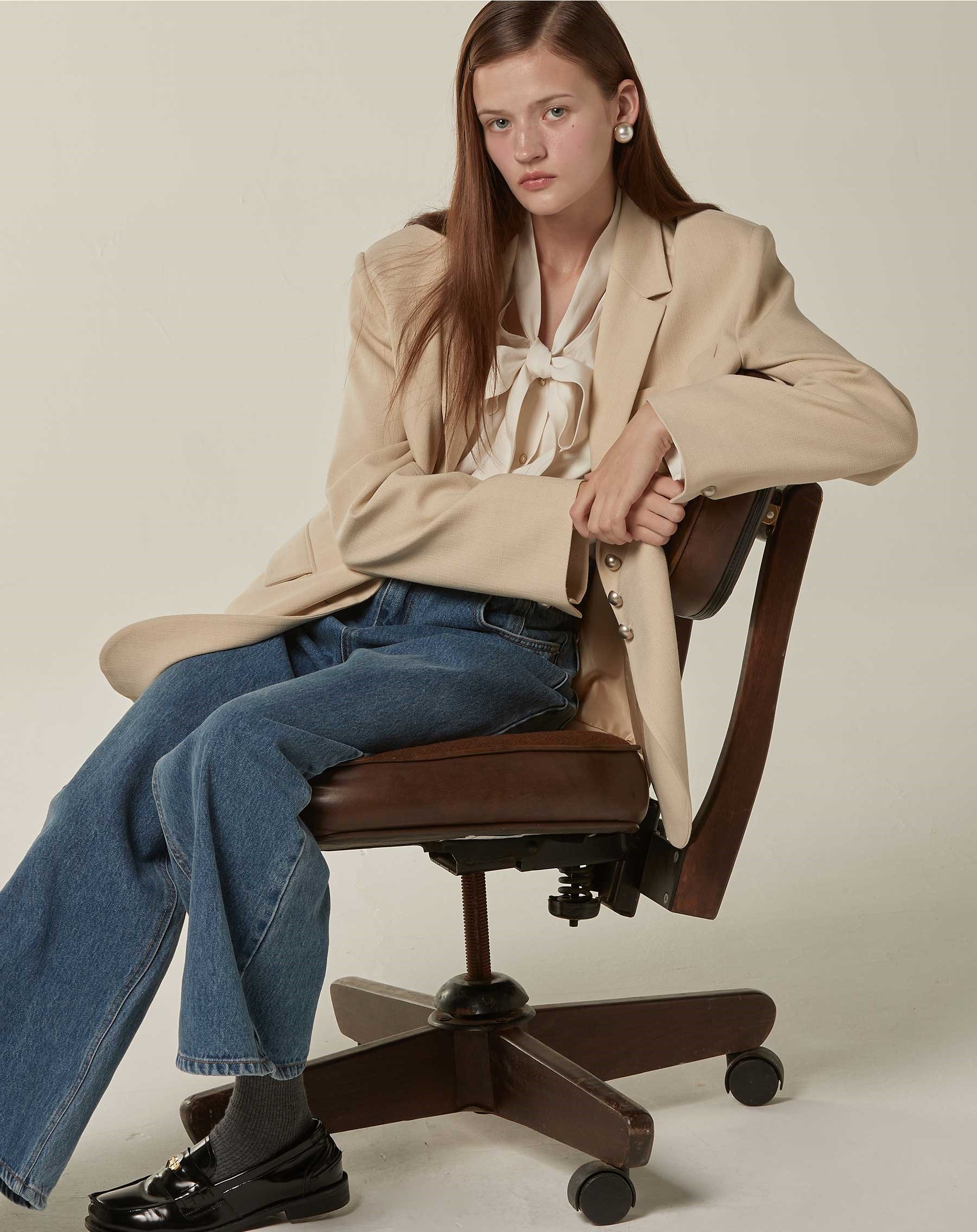 비뮤즈맨션 오버핏 버튼 포인트 싱글 재킷 - 라이트 베이지와 함께 클래식하면서도 트렌디한 스타일을 완성해보세요!