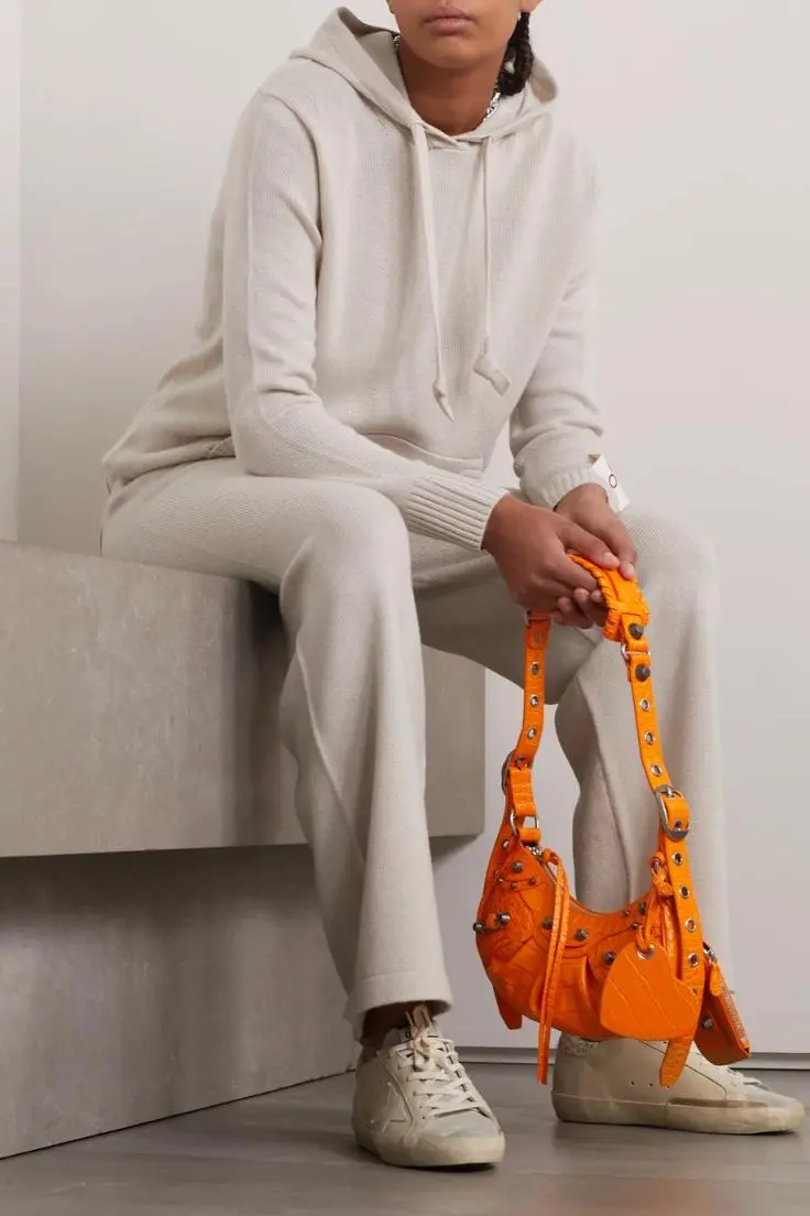 블랙 슬랙스와 로퍼를 매치하여 골든구스 캐시미어 울 블렌드 후드티를 착용하면 고급스럽고 편안한 스타일을 연출해보세요.