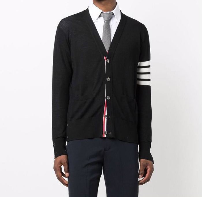 화이트 셔츠와 블랙 슬랙스를 매치하여 톰브라운 4바 메리노 울 가디건을 착용하면 클래식하면서도 트렌디한 스타일을 연출해보세요.