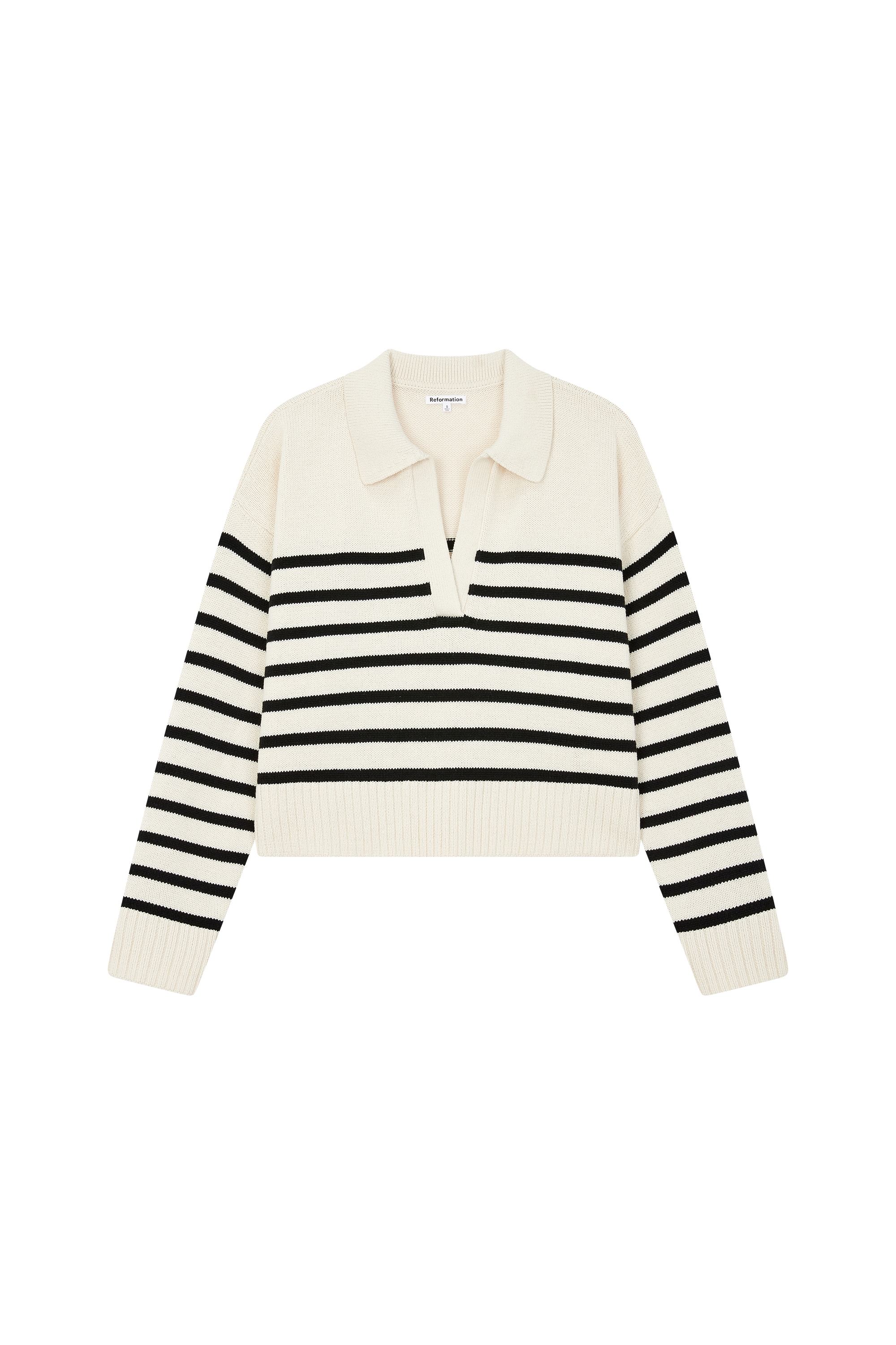 리포메이션 스트라이프 코튼 폴로 니트 - 아이보리는 클래식한 아이보리 색상과 네이비 스트라이프 디자인으로 여성스러운 폴로 니트입니다.