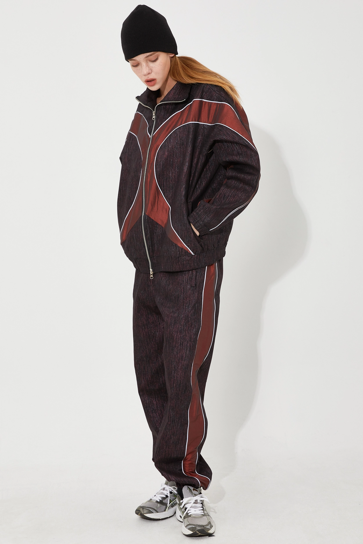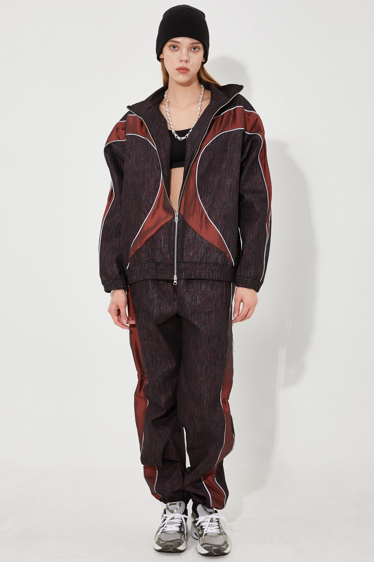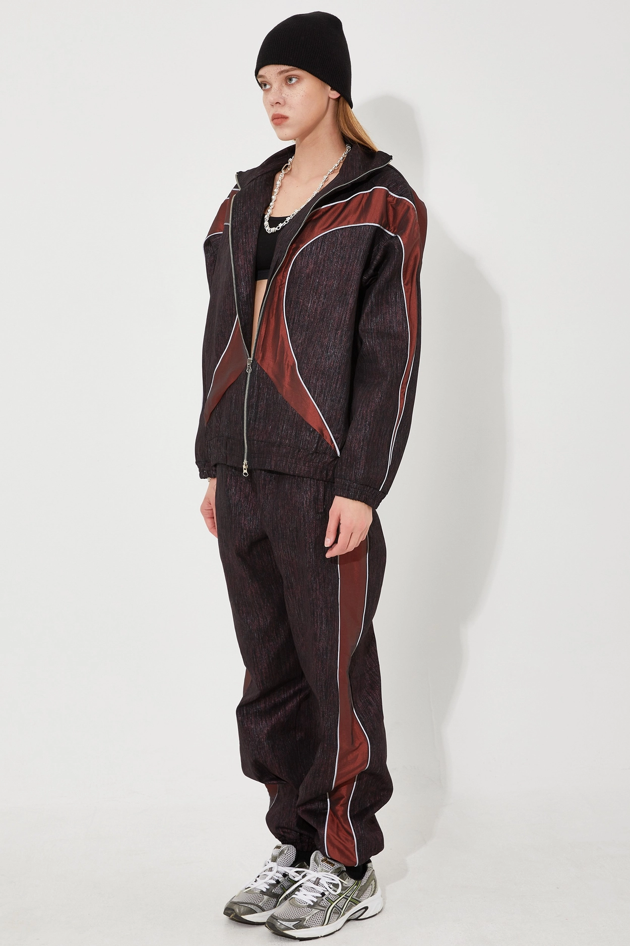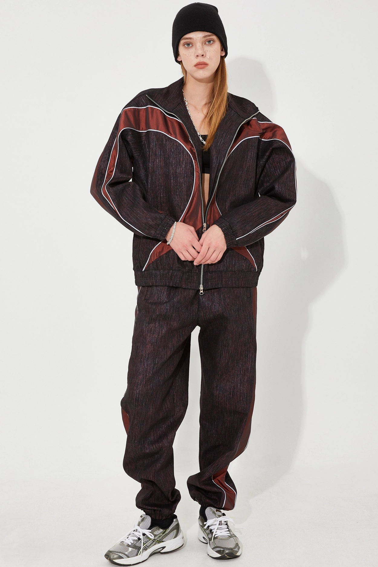 SS 24 파이핑 데님 스웨트 재킷 버건디를 후드티, 트랙팬츠, 스니커즈와 함께 매치하여 트렌디한 스트릿 스타일을 연출하세요.