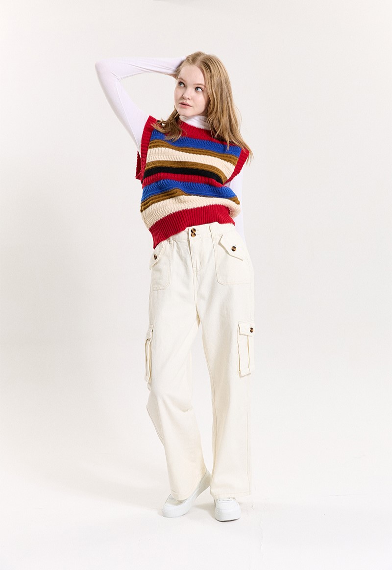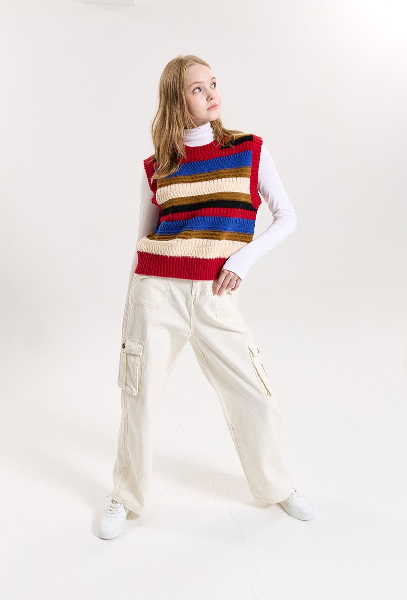 코지 스트라이프 조끼_블랙을 분홍색이나 노란색과 같은 컬러풀한 옷들과 함께 매치하여 컬러풀하고 개성있는 스타일을 연출하세요.