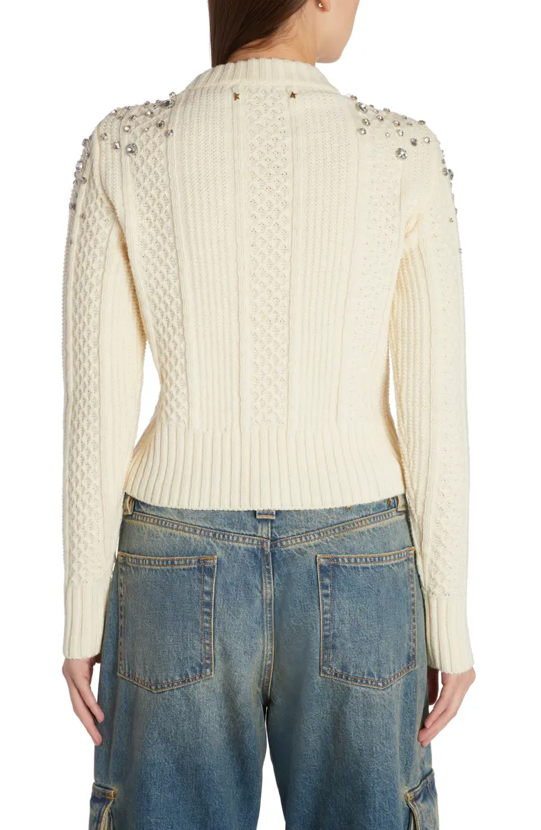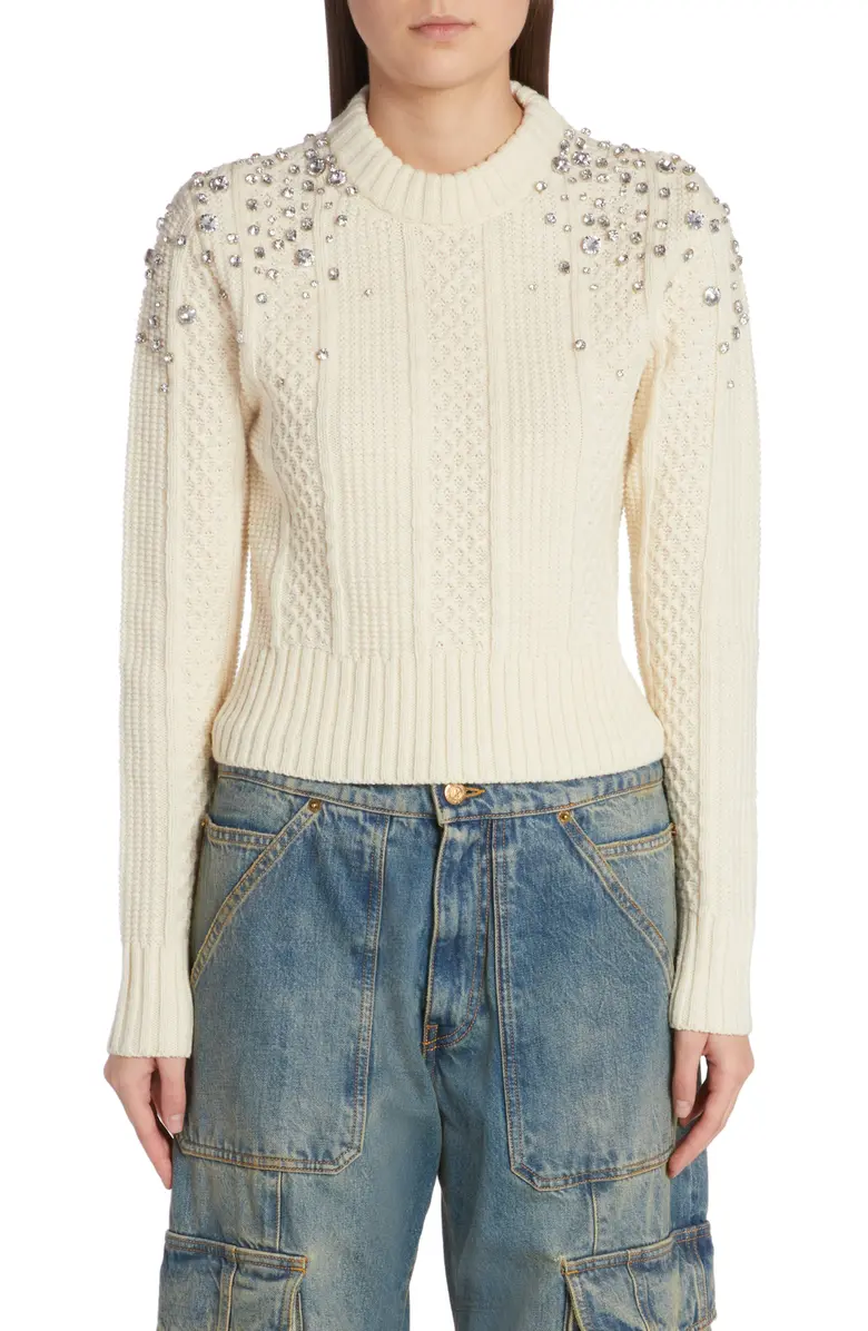 크리스탈 장식 버진 울 케이블 니트 크루넥 스웨터를 심플한 흰색 티셔츠와 청바지와 함께 매치하여 캐주얼하면서도 세련된 스타일을 연출하세요.