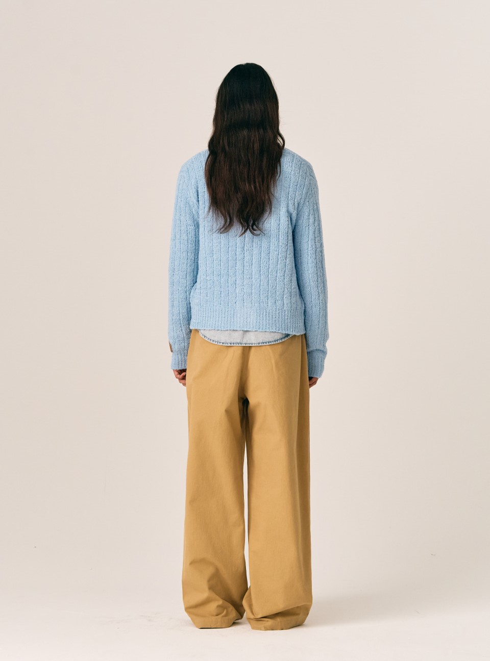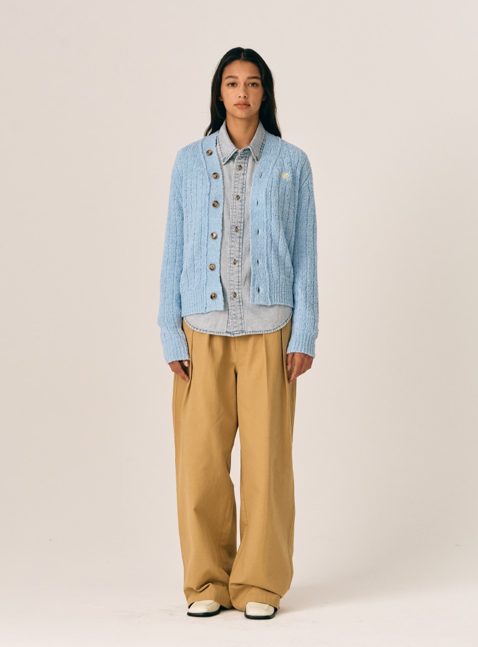 오버 사이즈 울 블렌드 가디건 베이비 블루를 셔츠나 맨투 위에 레이어드하여 따뜻하면서도 스타일리쉬한 레이어드 스타일을 연출하세요.
