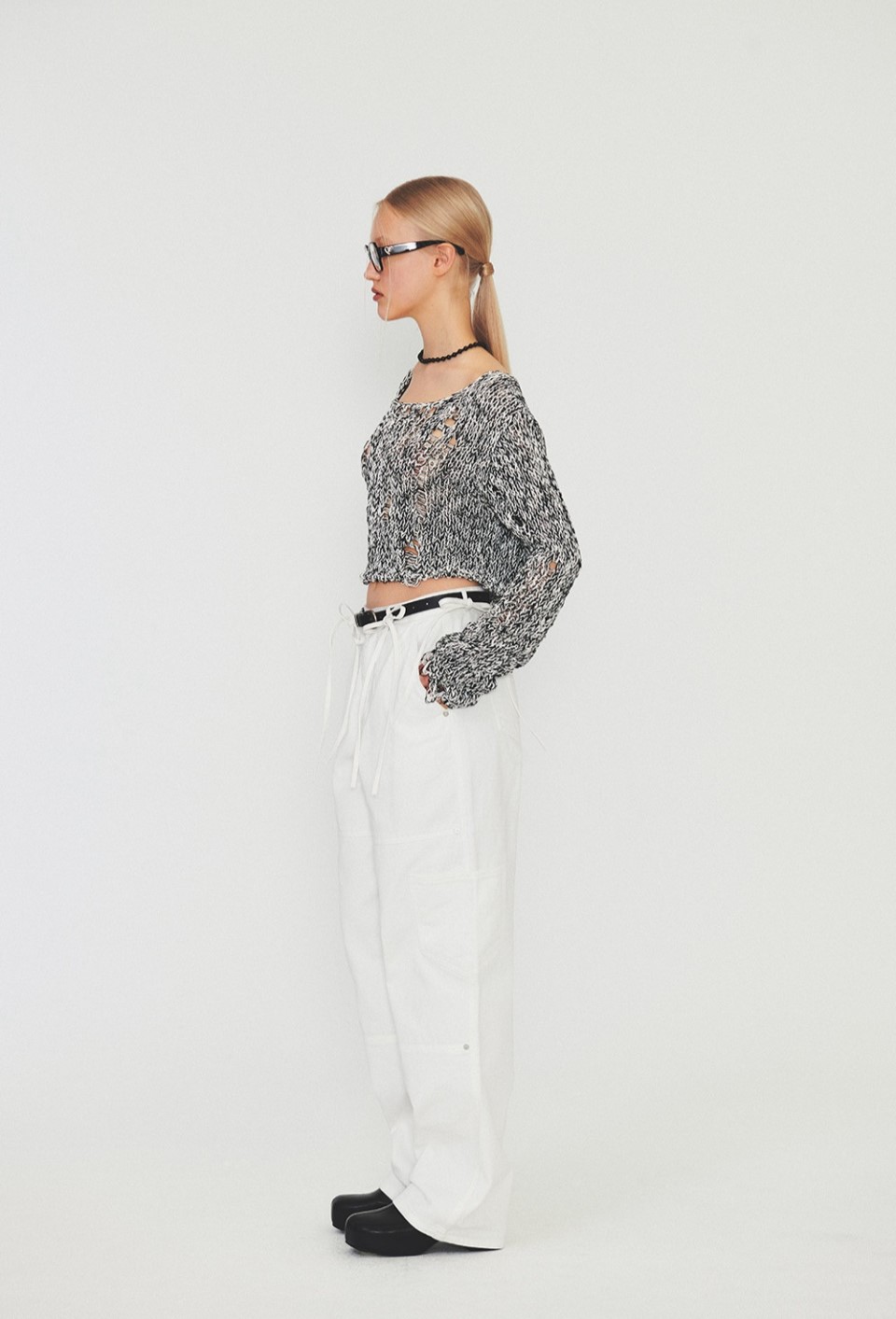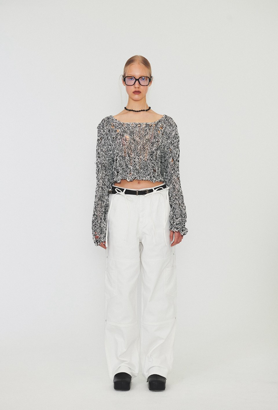 DIAGONAL NETTING CROP KNIT (mix1)를 스커트나 롱 드레스와 함께 매치하여 여성스럽고 로맨틱한 페미닌 스타일을 연출하세요.