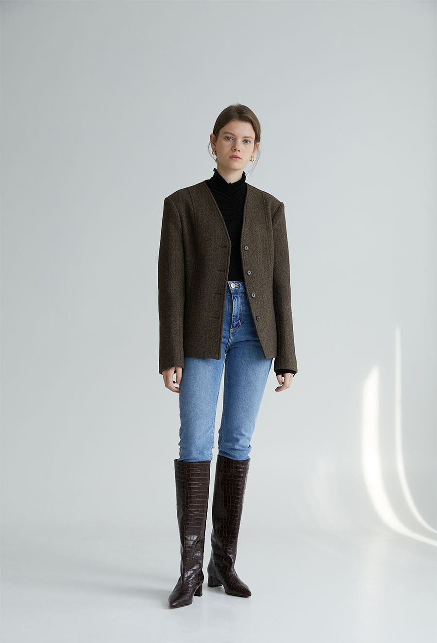 패브릭컬러지 노 칼라 하프 자켓을 하이웨스트 청바지와 플랫폼 슈즈와 함께 매치하여 레트로 스타일을 연출하세요.
