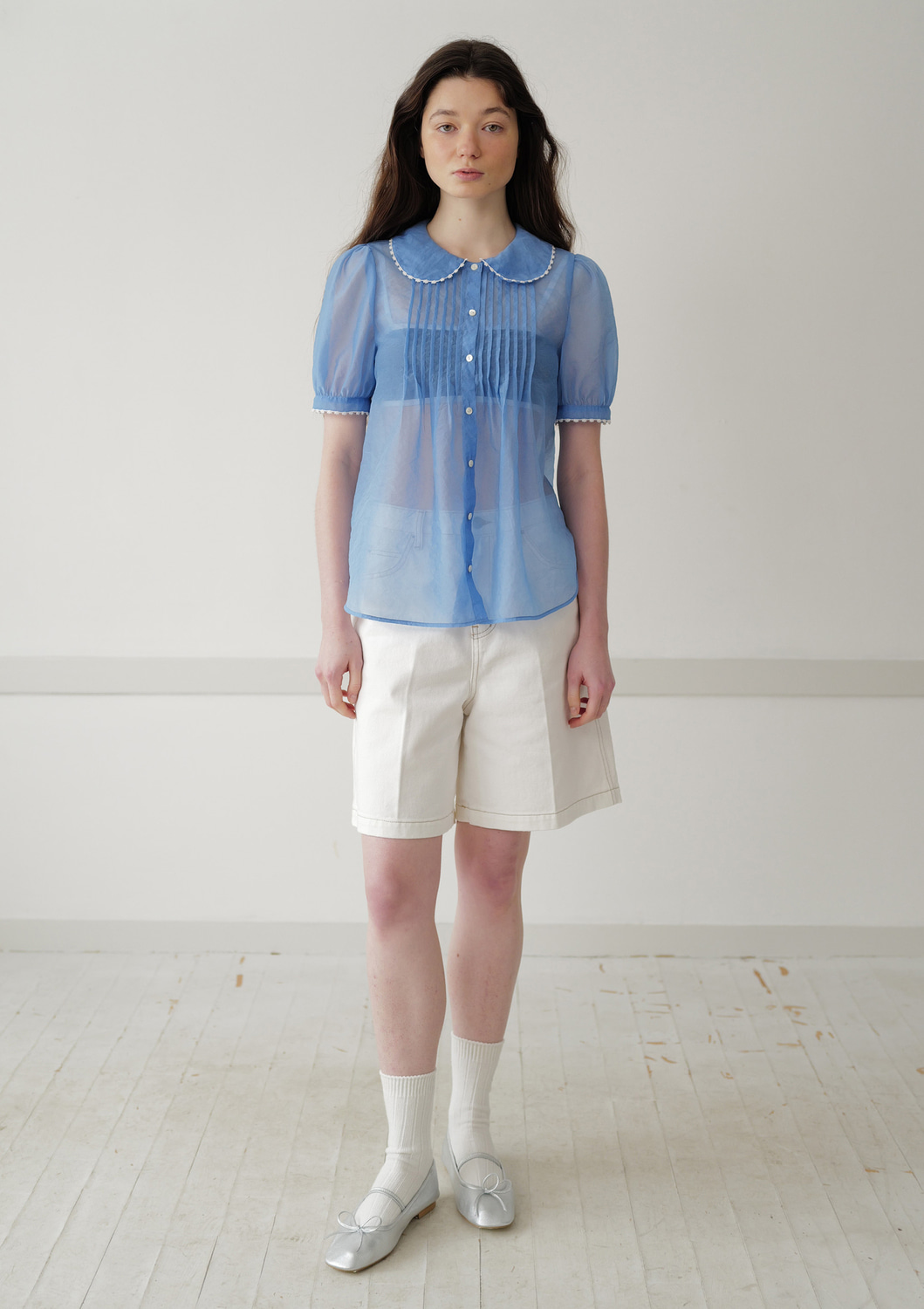 시즌 컬러 보여줄 수 있는 비치는 원단으로 제작된 라운드 카라 블라우스입니다. 퍼프 슬리브와 앞판 핀턱 디테일로 러블리한 무드를 보여준 완성도가 높은 제품입니다. 데님, 스커트 등 다양한