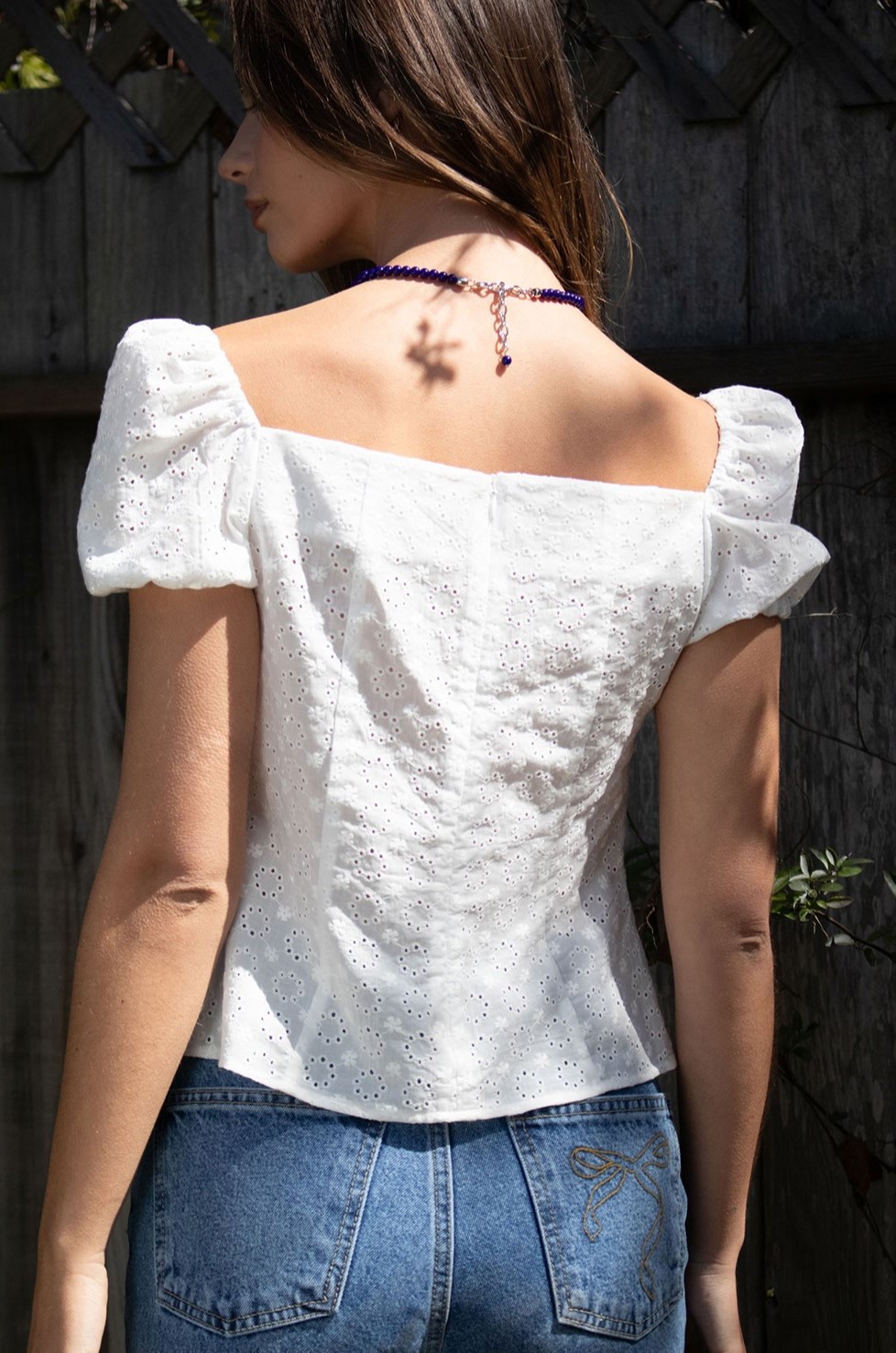 펀칭 레이스 디테일은 우아하고 로맨틱한 분위기를 연출하며, 깔끔하고 세련된 아이보리 컬러는 다양한 스타일링에 활용하기 쉬운 베이직 아이템입니다.