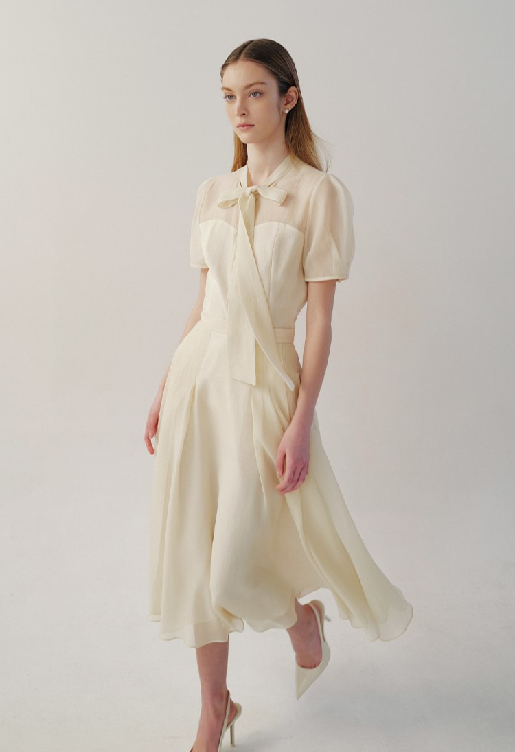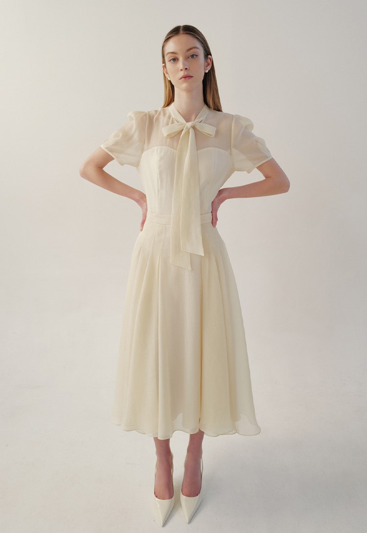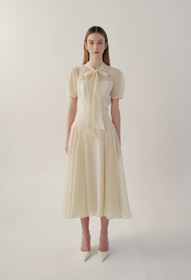 릴리본 타이 디테일로 포인트를 주어 여성스럽고 우아한 분위기를 연출합니다.