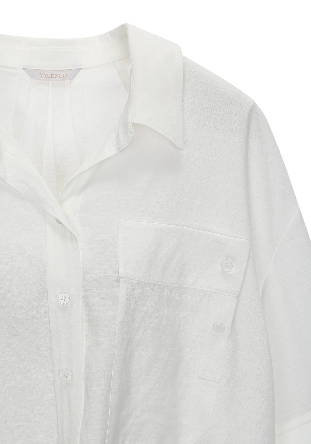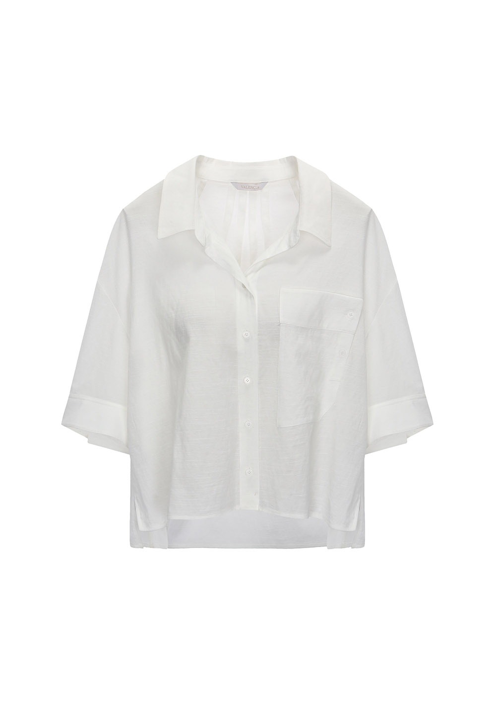 발렌시아 사이드 원포켓 언발 블라우스는 부드러운 레이온 소재로 제작되어 편안한 착용감을 제공하는 세련되고 여성스러운 블라우스입니다.