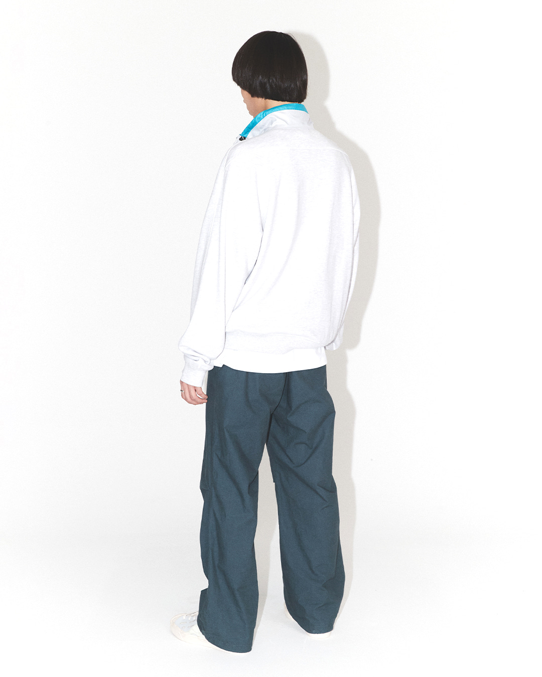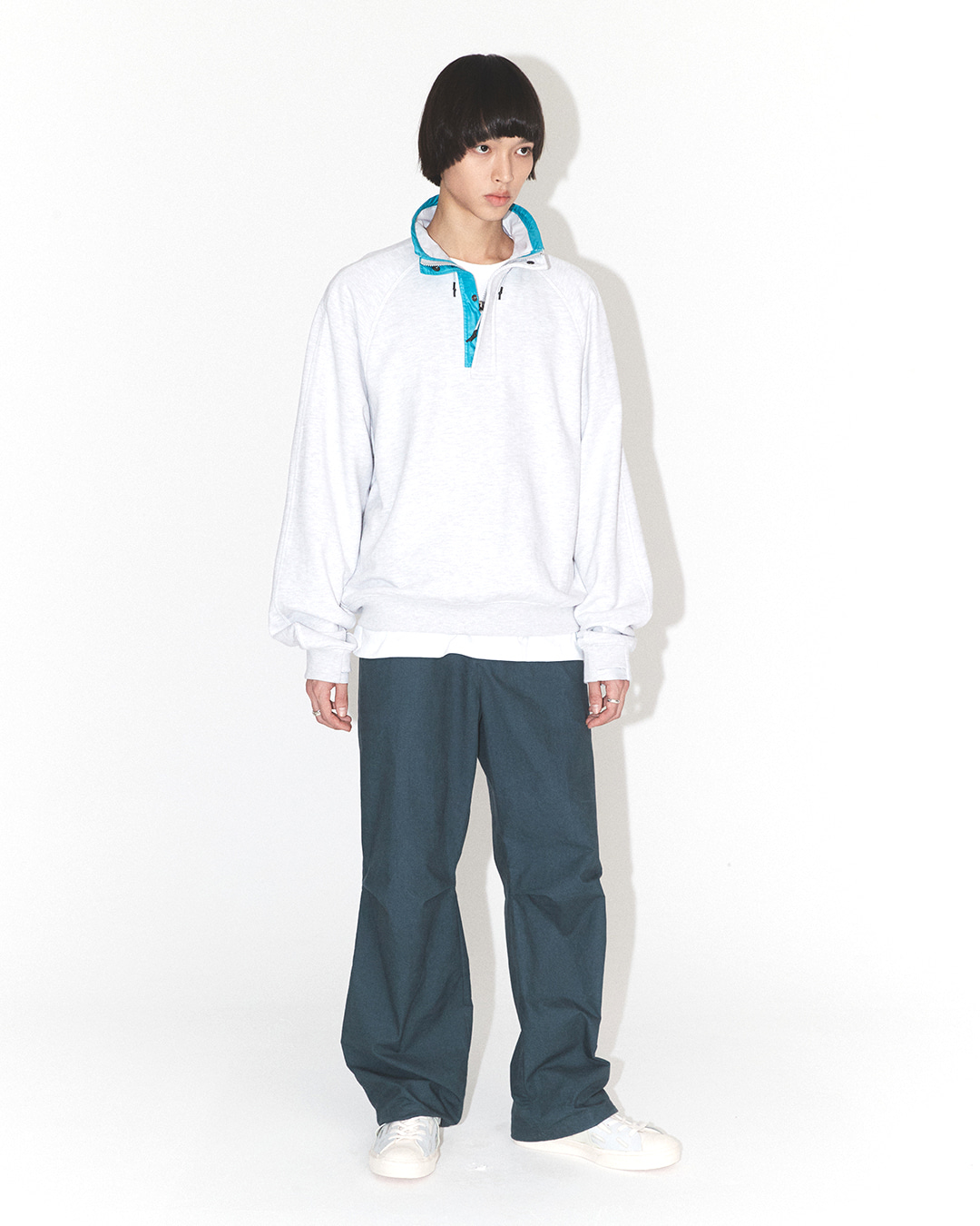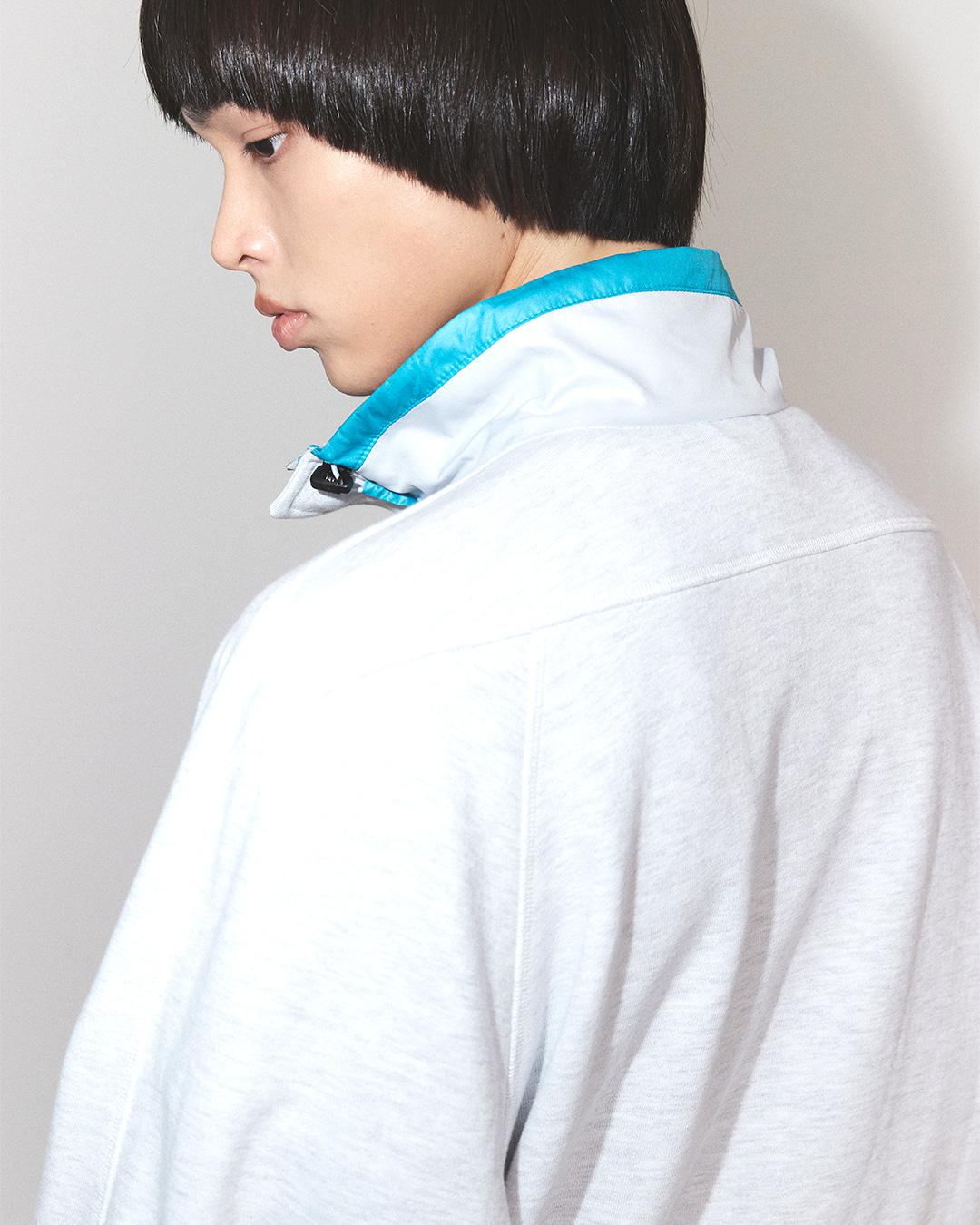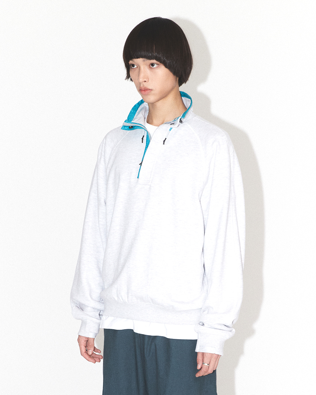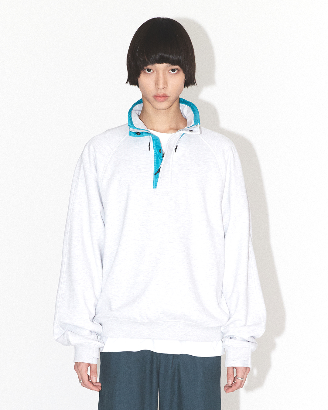 언어펙티드(UNAFFECTED) STAND COLLAR HALF ZIP SWEAT / L.GREY MELANGE. DESCRIPTION - Outshell_1 : 100% Cotton - Outshell_2 : 100% Cotton - Outshell_3 : 100% Nylon - Outshell_4 : 100% Nylon - Features a stand collar - Front half zip and hidden snap butto