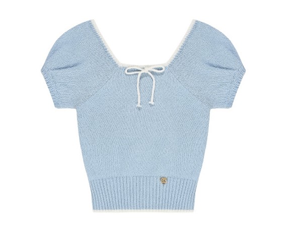 리본 디테일과 반소매 디자인이 특징인 이 니트는 다양한 스타일링에 활용할 수 있습니다.