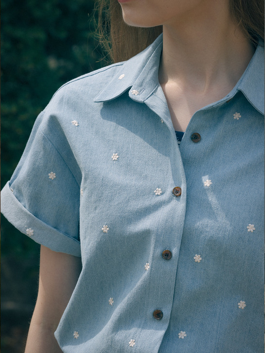 [KNOWN BETTER 노운베러] Flower embroidery half sleeve denim shirts_Sky Blue