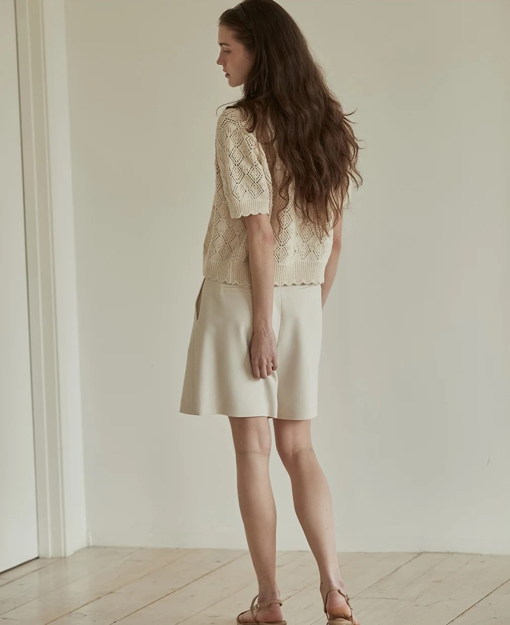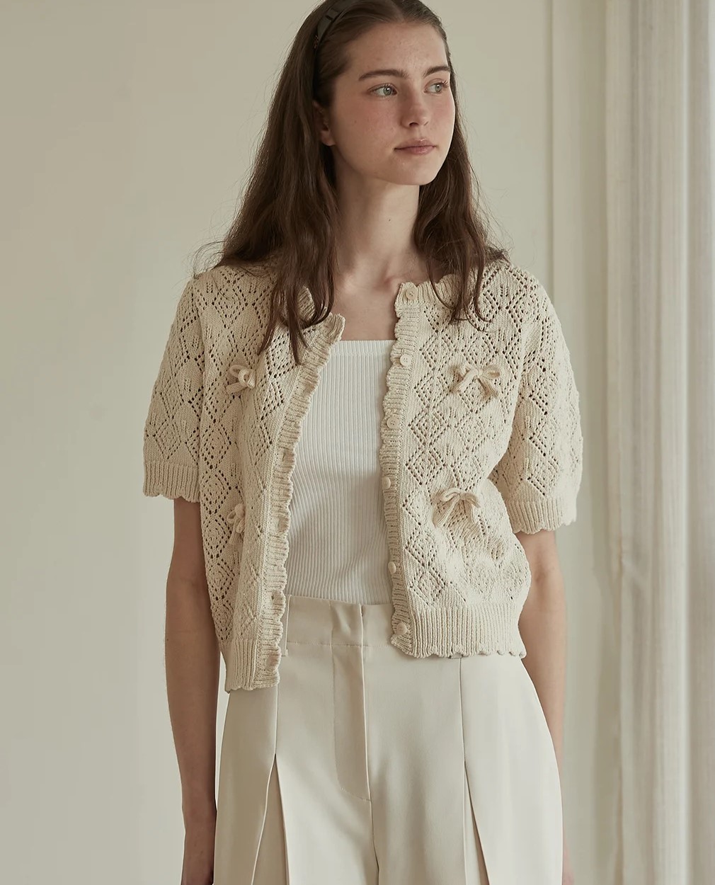 세심한 리본 디테일이 돋보이며, 고급스러운 크림 컬러가 다양한 스타일링에 활용될 수 있습니다.