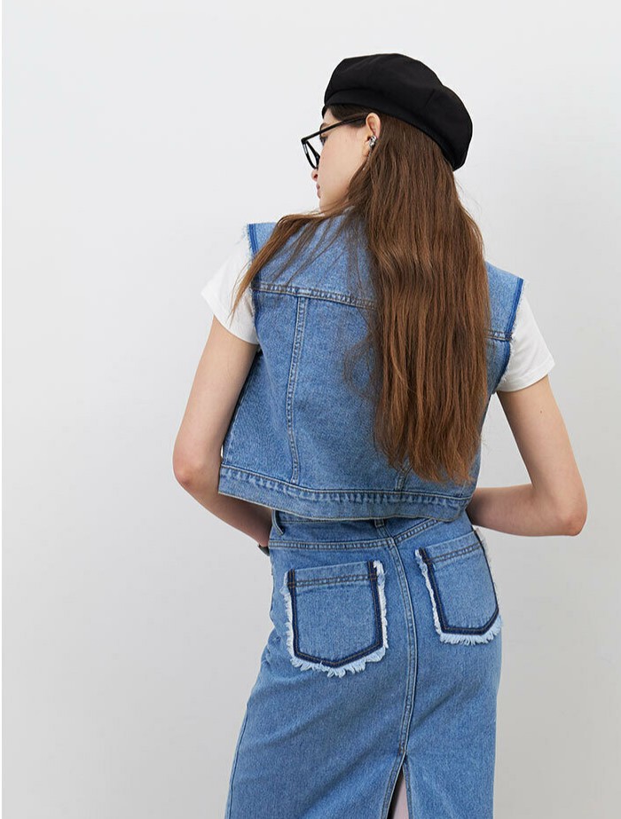 이 데님 베스트는 심플하면서도 스타일리시한 디자인으로 다양한 룩에 활용하기 좋습니다.