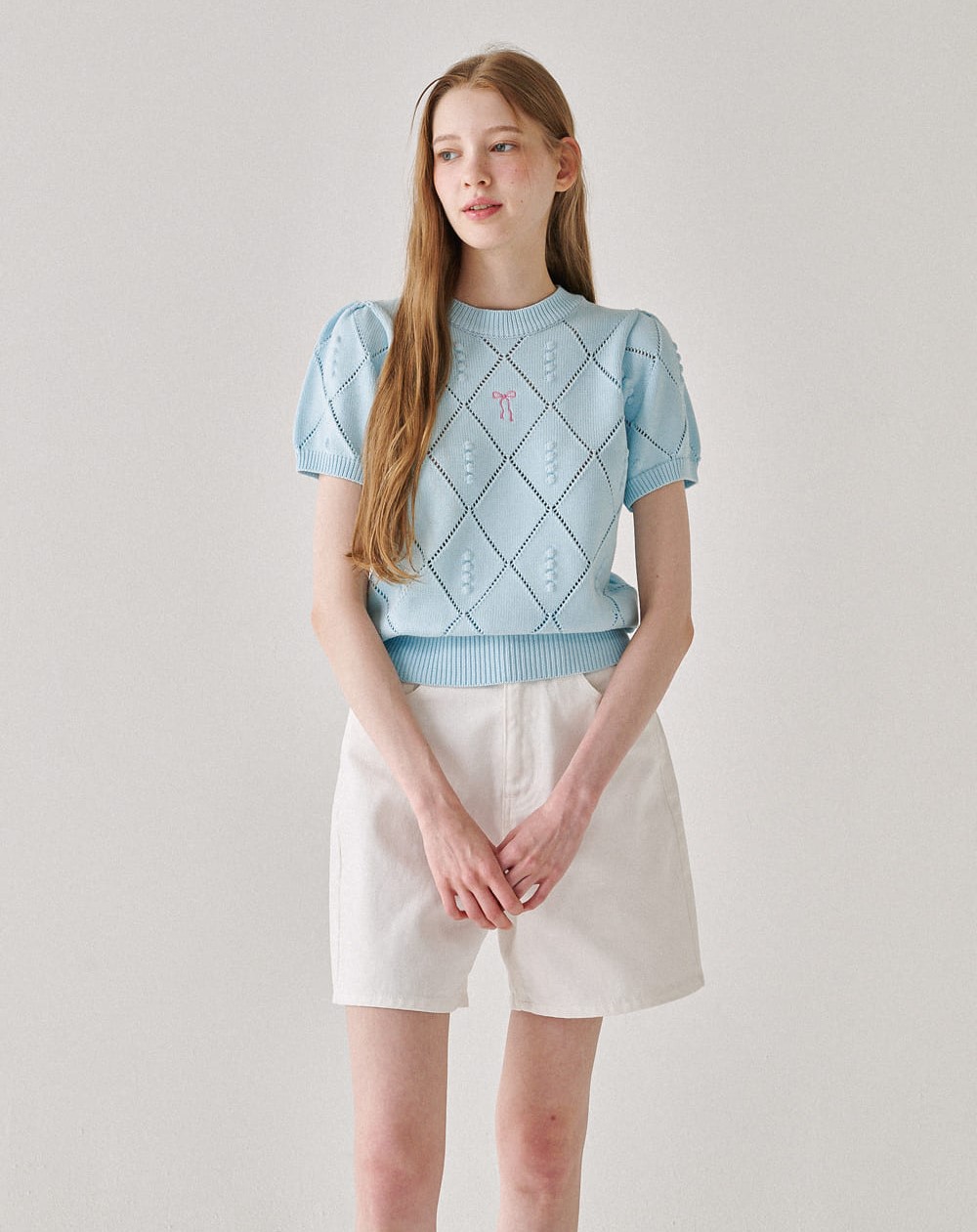제품분류 : 상의 > 니트/스웨터 브랜드 : 론론(RONRON) 제품번호 : RR24BKT3600SB 제품 : DIAMOND SCOTCH PUFF SHORT SLEEVE KNIT SOFT BLUE - 79,200