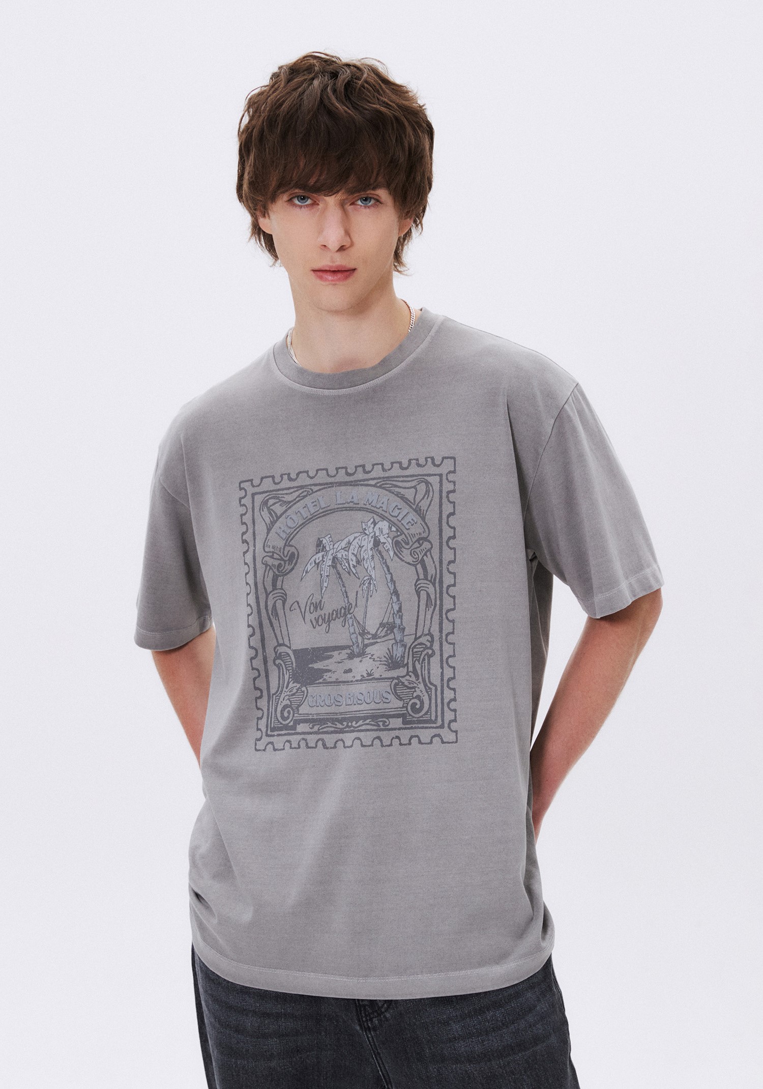 이주승이 선택한 아이템은 수아레의 호텔 스탬프 다잉 티셔츠 라이트 그레이입니다.