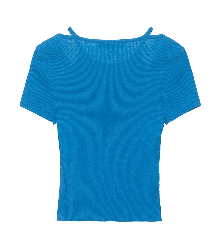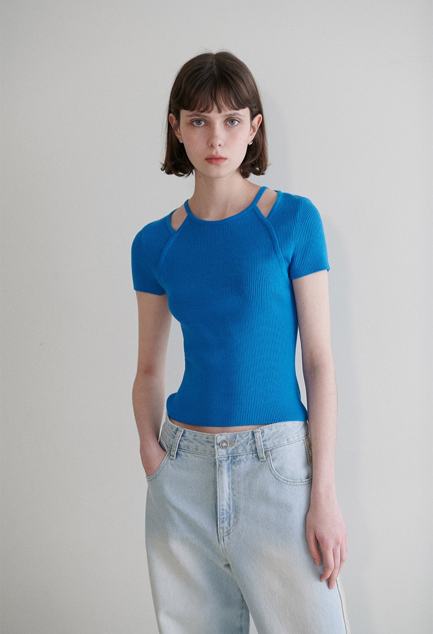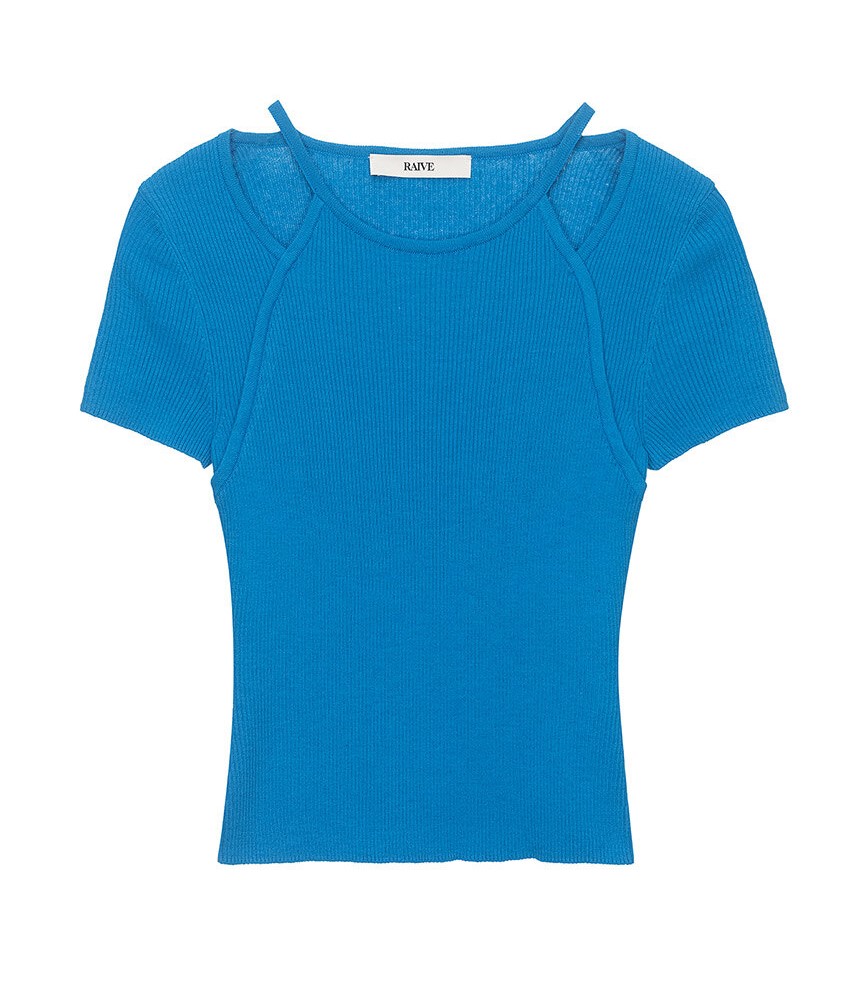송해나 씨가 선택한 이 아이템은 **RAIVE(레이브)**의 Shoulder Slit Half Knit in Blue입니다.