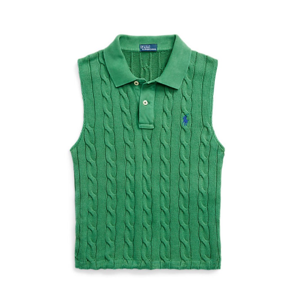 미주 씨가 선택한 이 아이템은 **POLO RALPH LAUREN(폴로 랄프 로렌)**의 여성 케이블 니트 크롭 폴로 셔츠입니다.