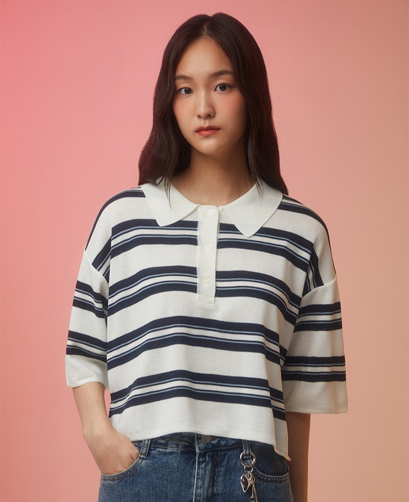 이영은 씨처럼 이 스트라이프 카라 니트를 슬랙스나 데님 팬츠와 매치해 보세요.
