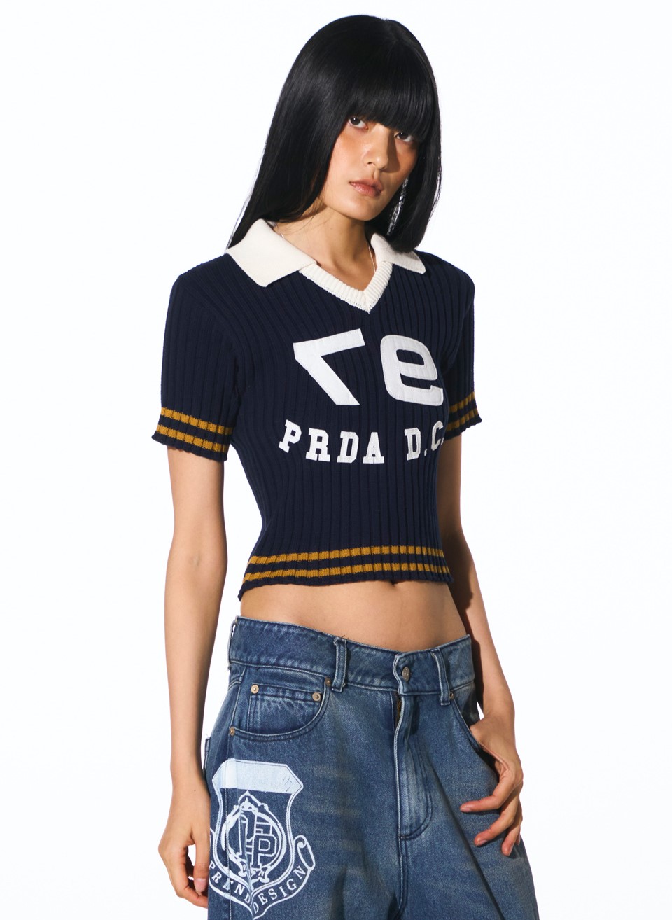 프렌다(PRENDA) COLOR BLOCK COLLAR CROP KNIT NAVY - 사이즈 & 후기 | 무신사