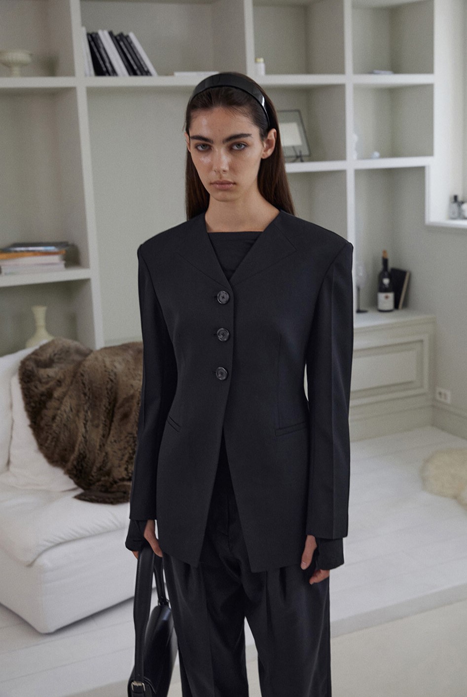 신민아 씨가 선택한 이 아이템은 **EMKM(으음키임)**의 Collarless Wool Jacket BLACK입니다.