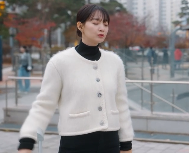이 브러시드 모헤어 가디건 재킷은 어떤 하의와도 잘 어울리지만, 신민아 씨처럼 슬림한 팬츠와 매치해 세련된 룩을 완성하는 것을 추천드립니다.