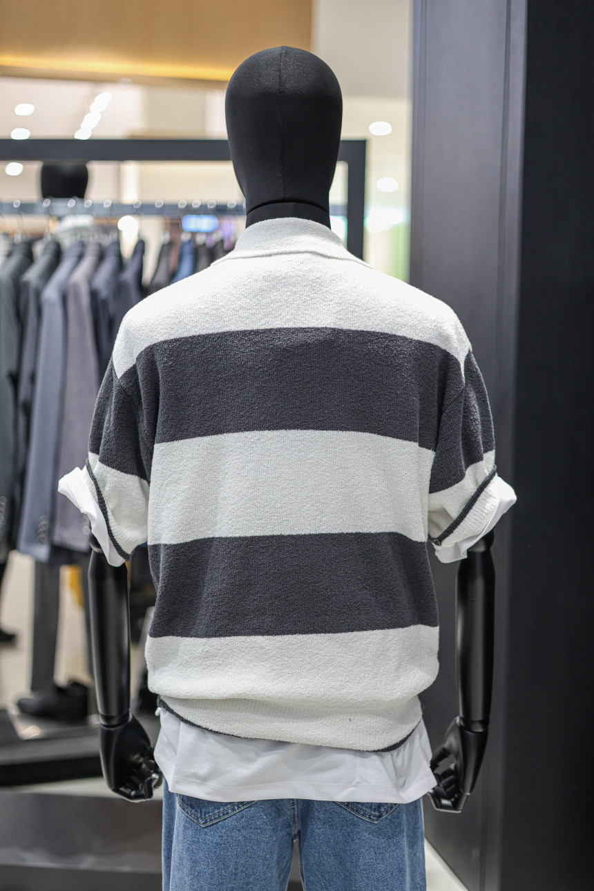 지오송지오 ZIOSONGZIO 셈블런스 스트라이프 오픈 카라 니트 - 다크그레이