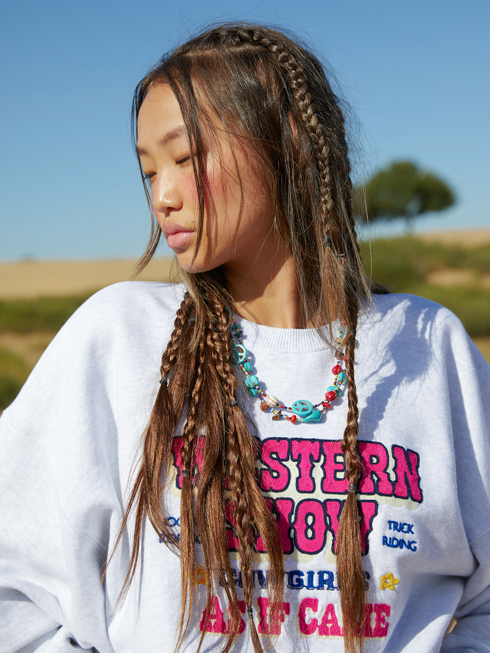 웨스턴 무드의 스웨트셔츠는 부츠와도 잘 어울리며, 빈티지한 악세서리로 포인트를 주면 더욱 감각적인 스타일을 연출할 수 있습니다.