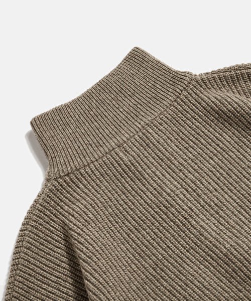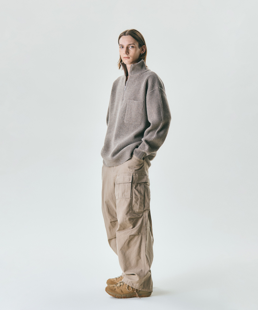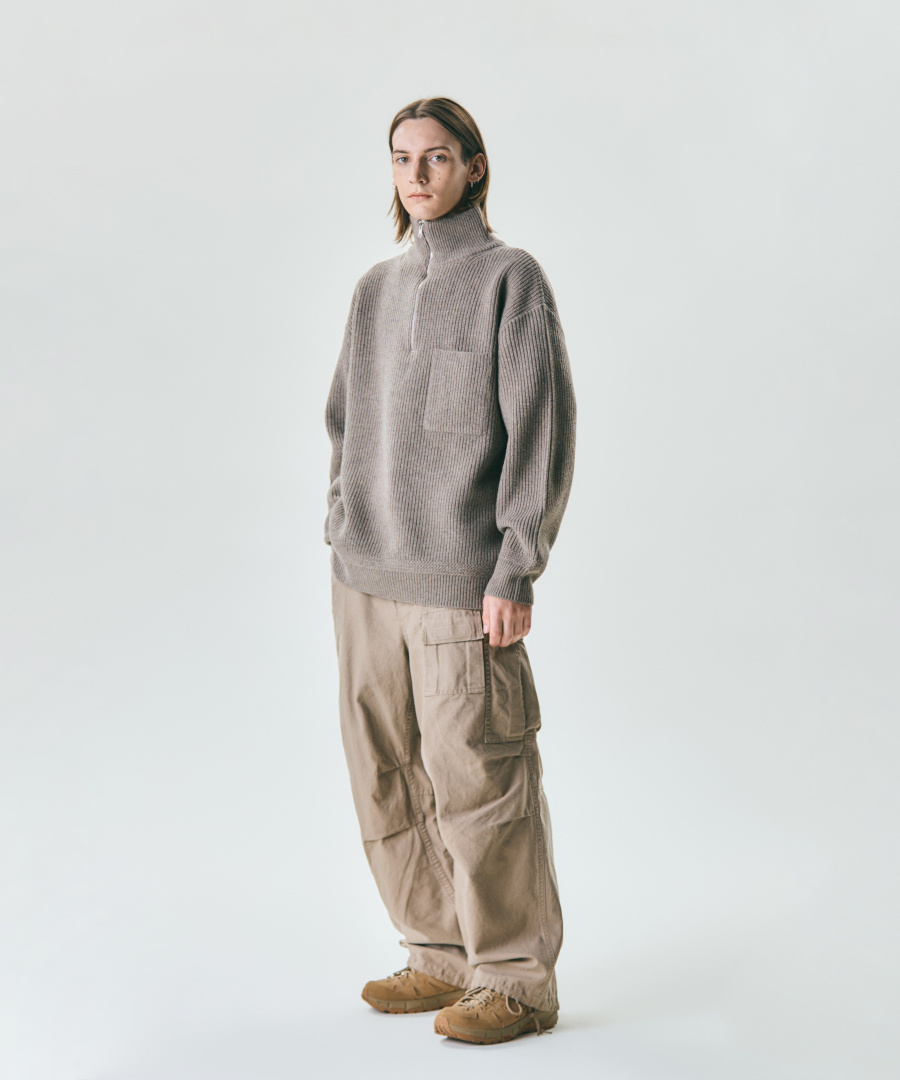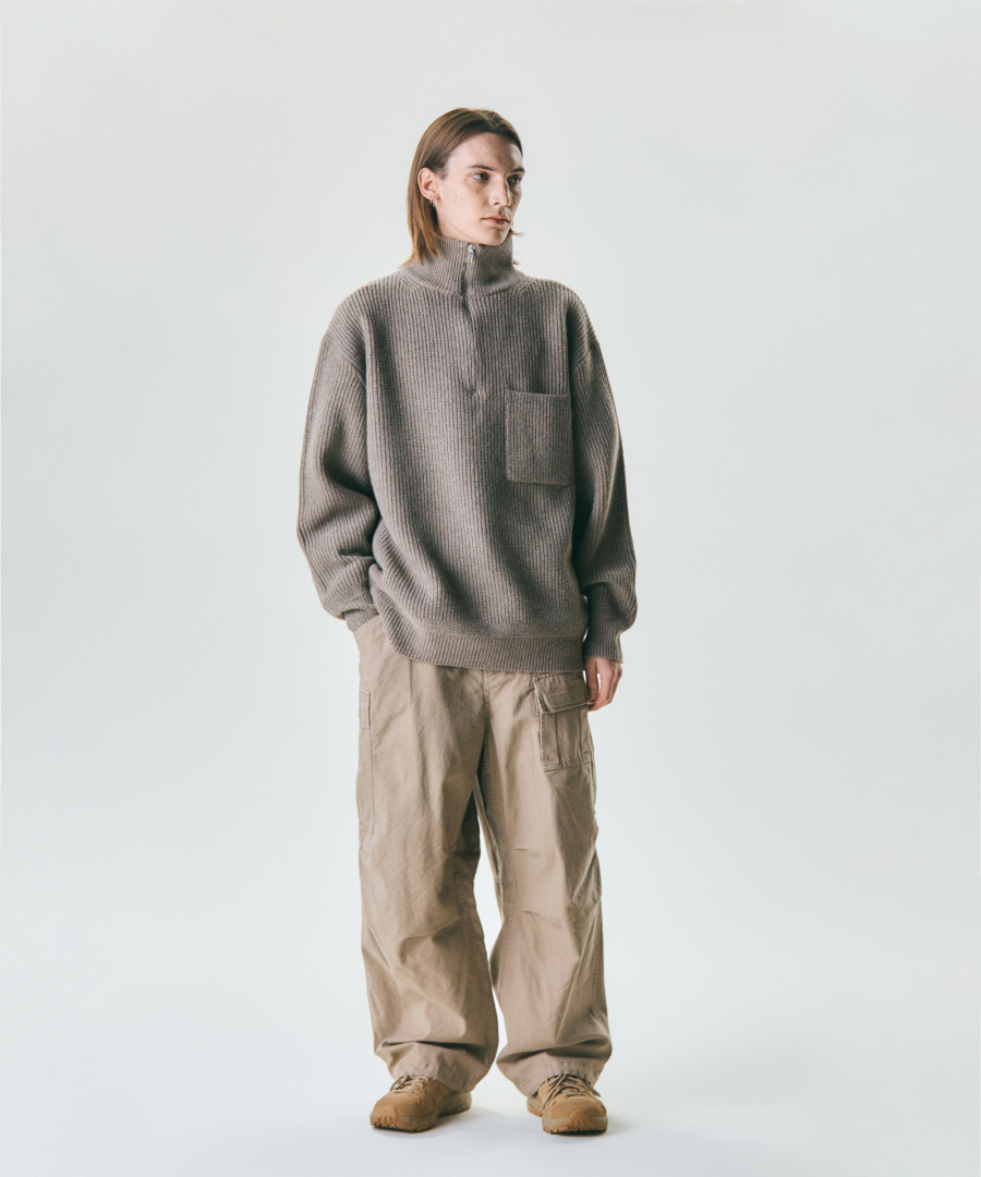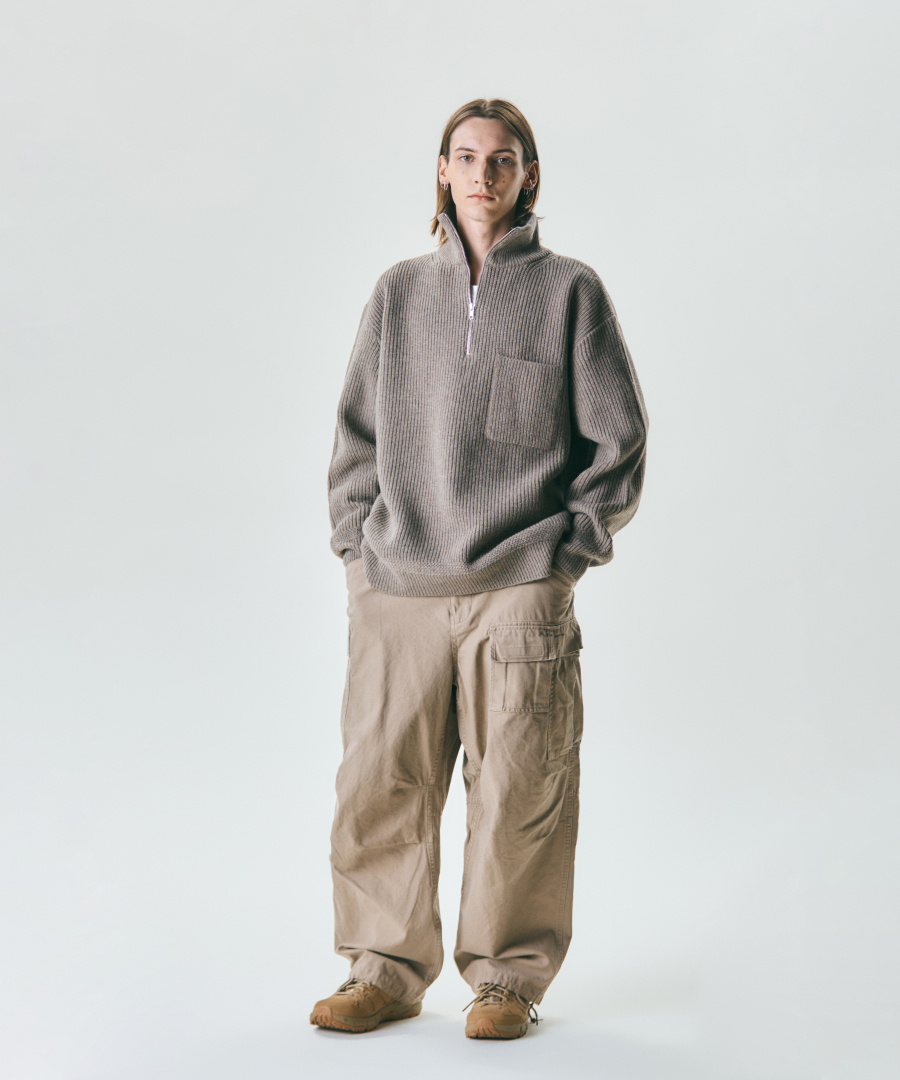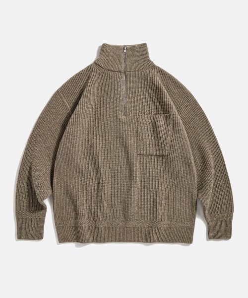 지퍼를 내려 카라탑 스타일 혹은 집업하여 터틀넥 형태로 스타일링 가능한 하프집 형태의 여유로운 피팅감을 가진 니트 스웨터