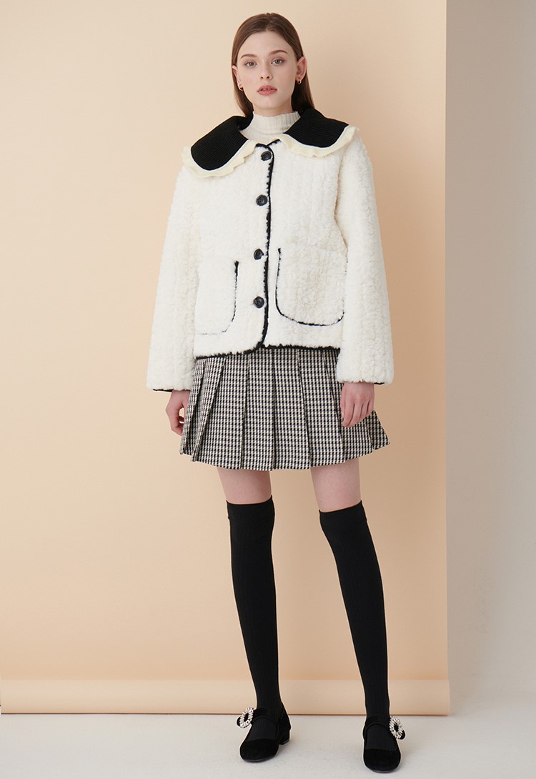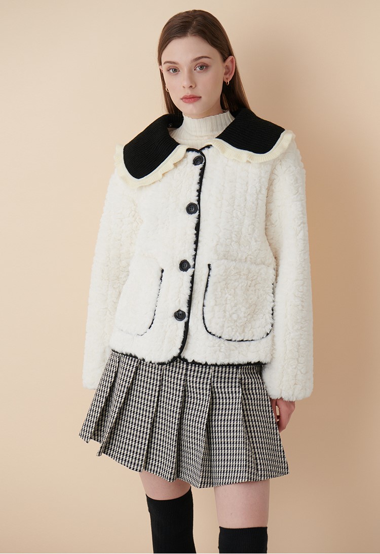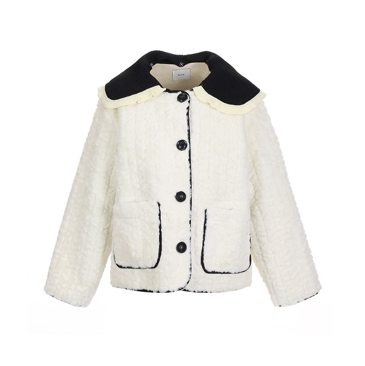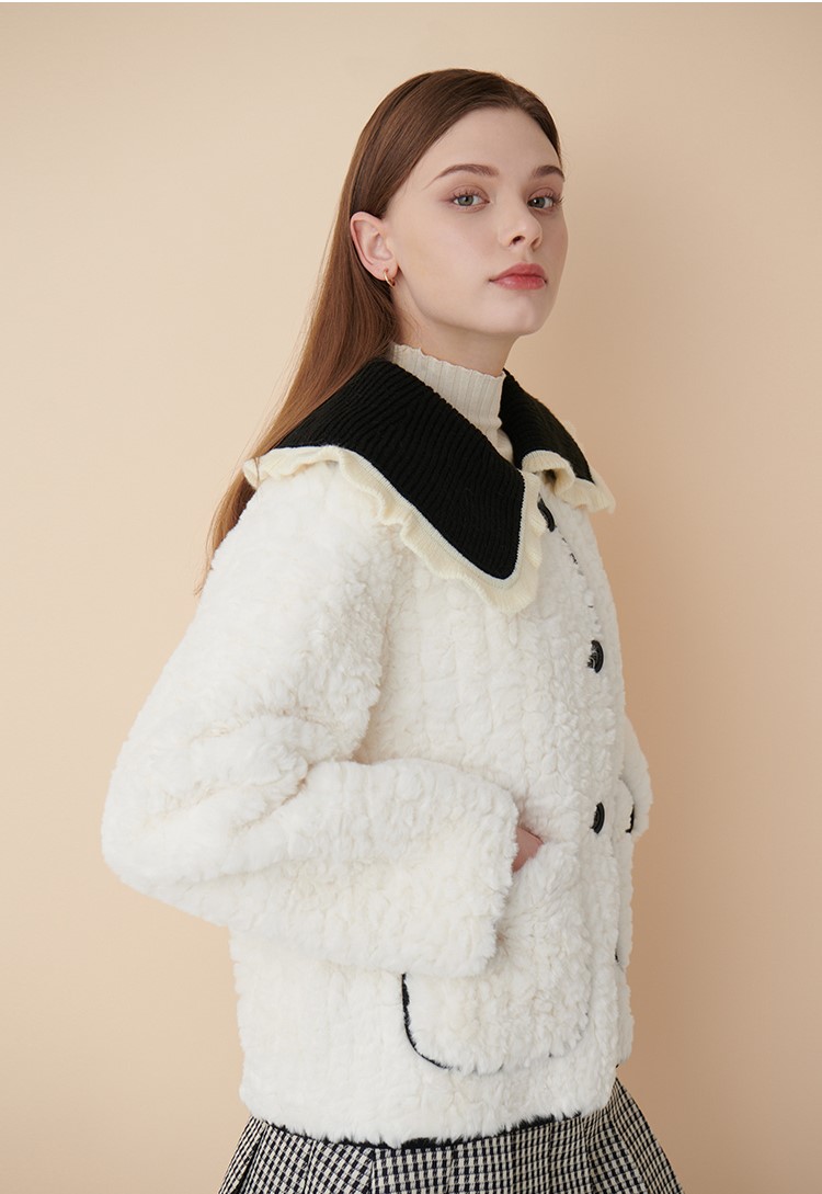 프릴 장식의 배식 니트 카라가 포인트인 뽀글이 자켓입니다.