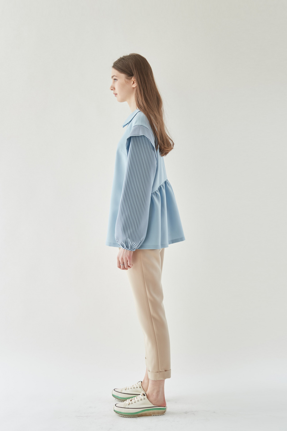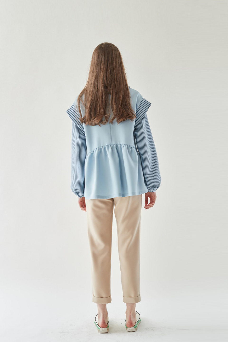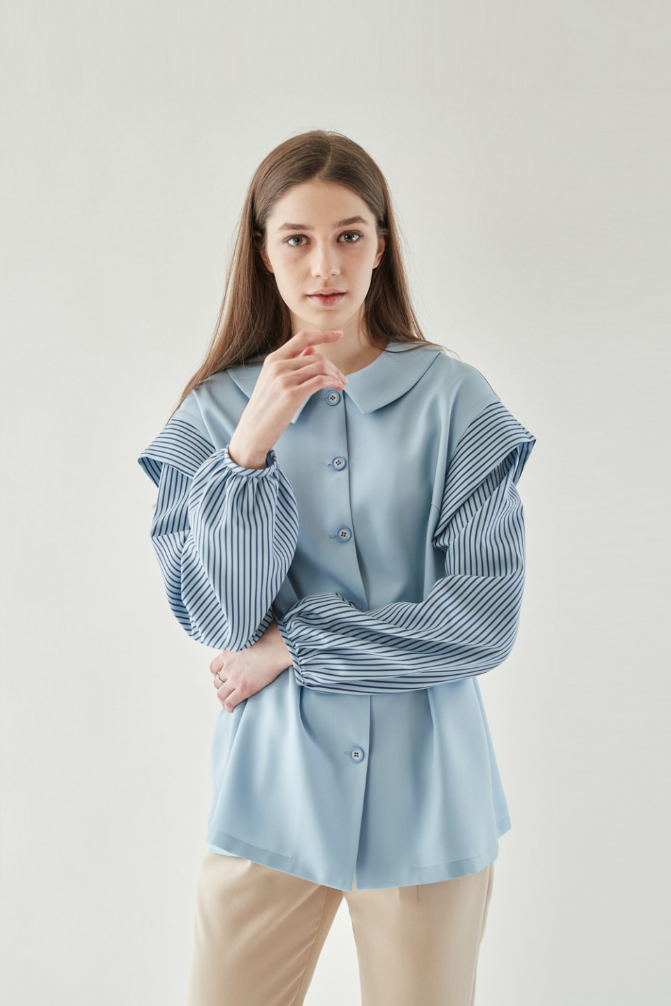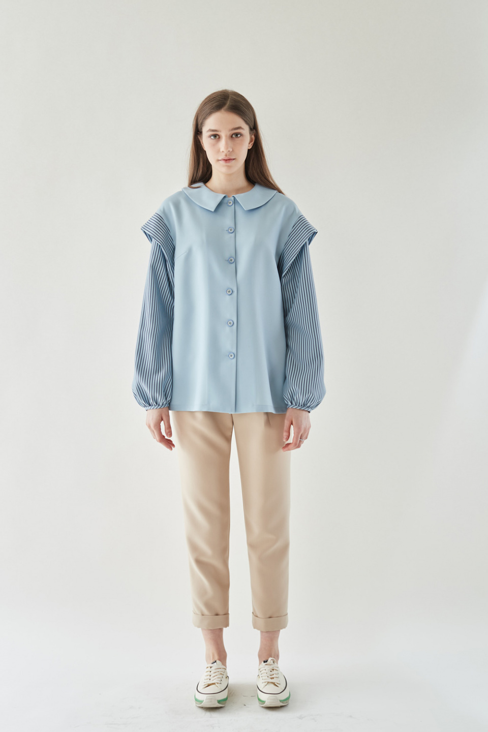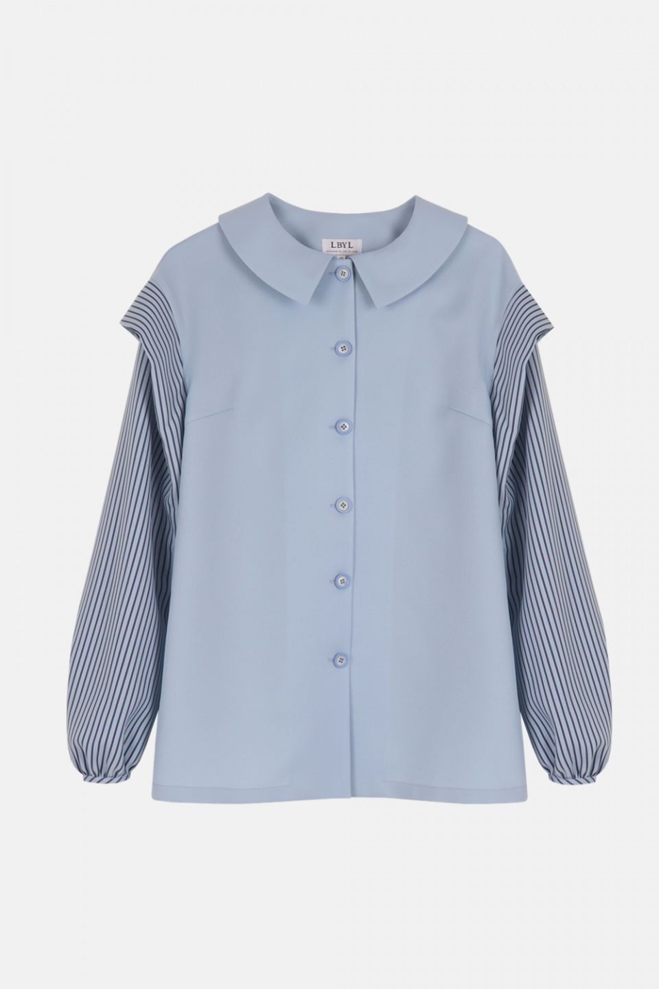 엘바이엘(LBYL) 블루 스트라이프 배색 카라 셔츠 블라우스 - 170,200 | 무신사 스토어